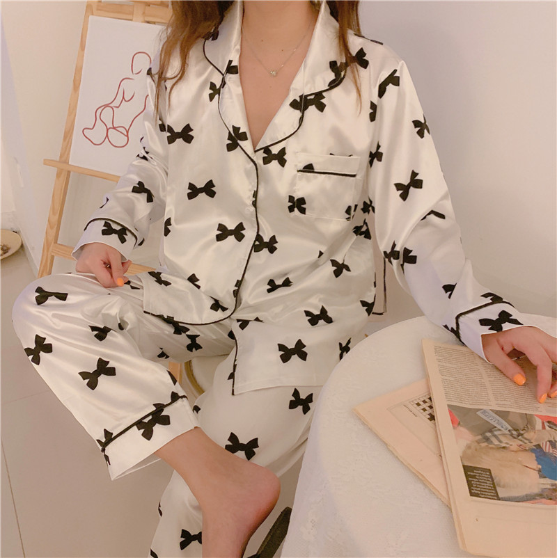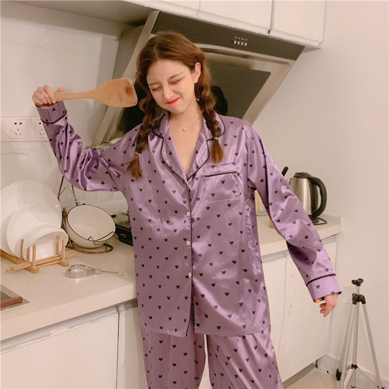 >> 實拍實價韓版長袖冰絲甜美愛心印花睡衣家居服套裝
