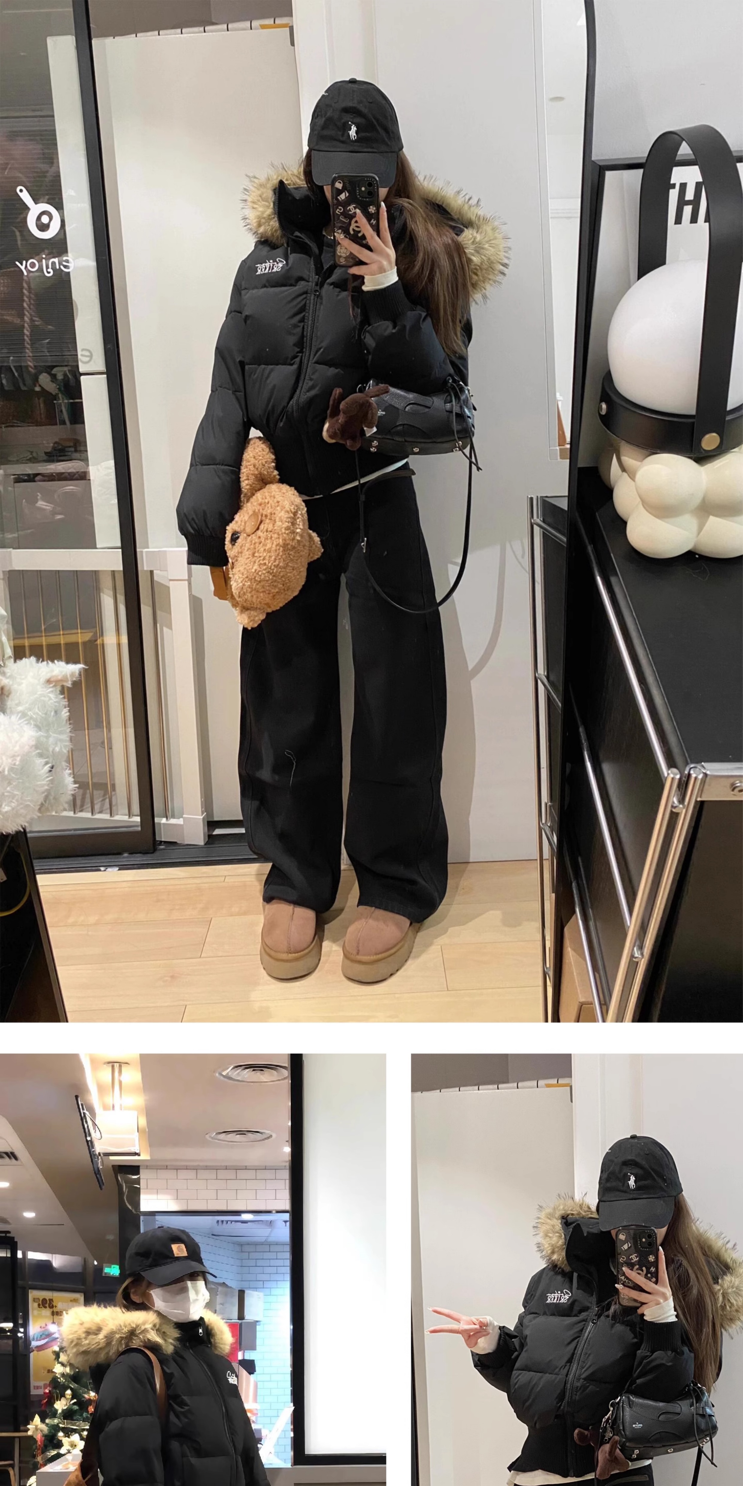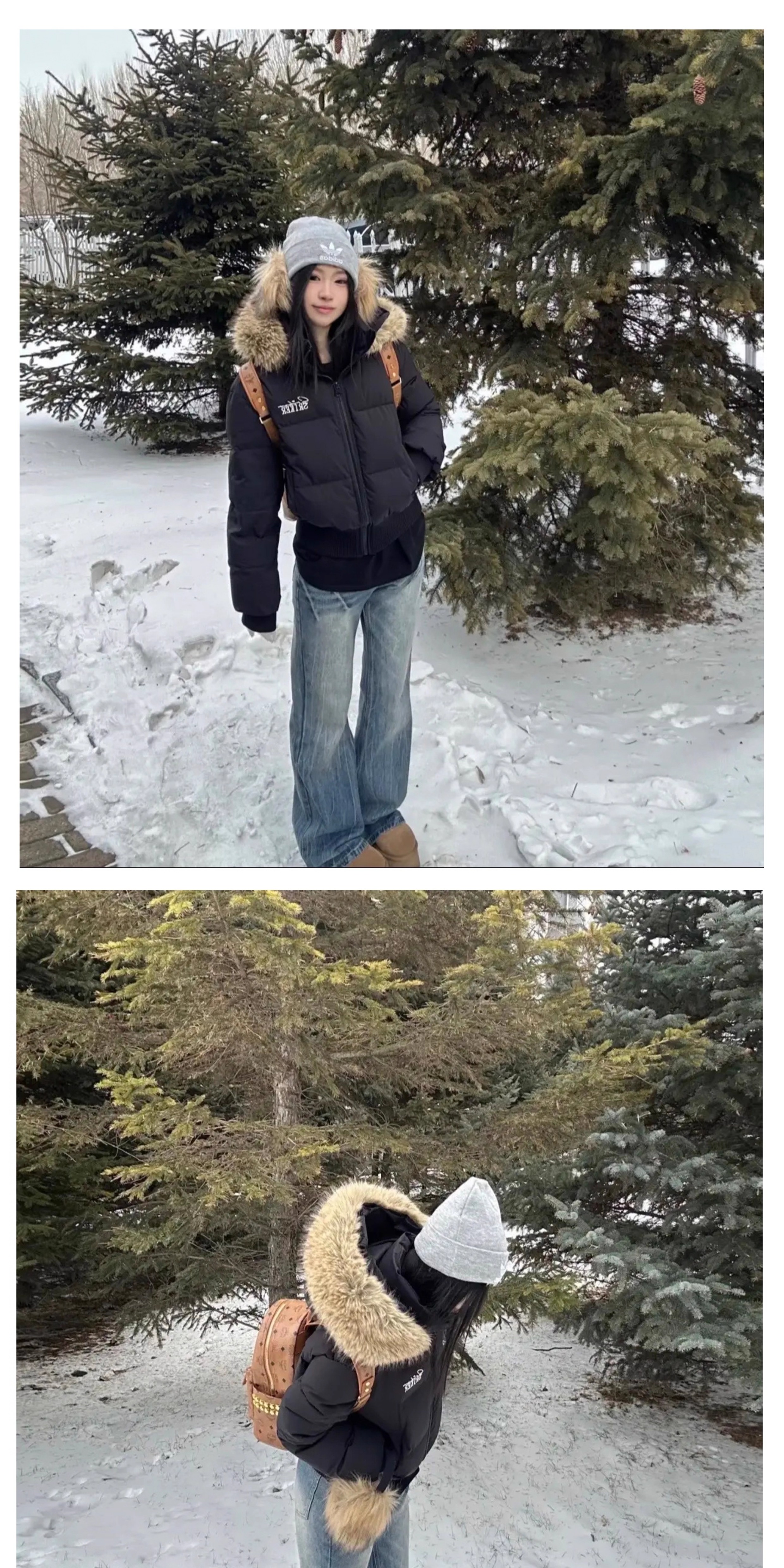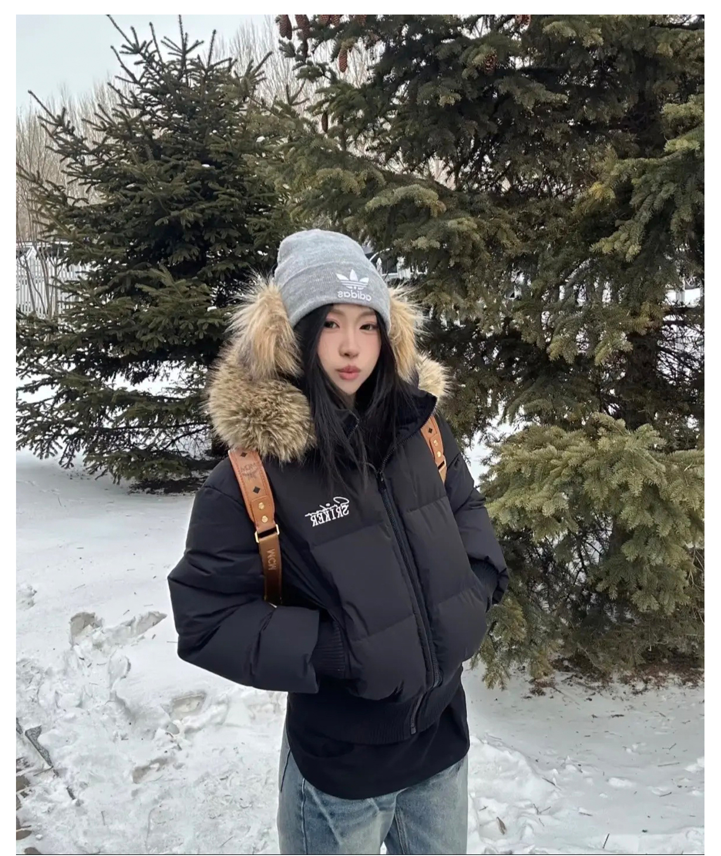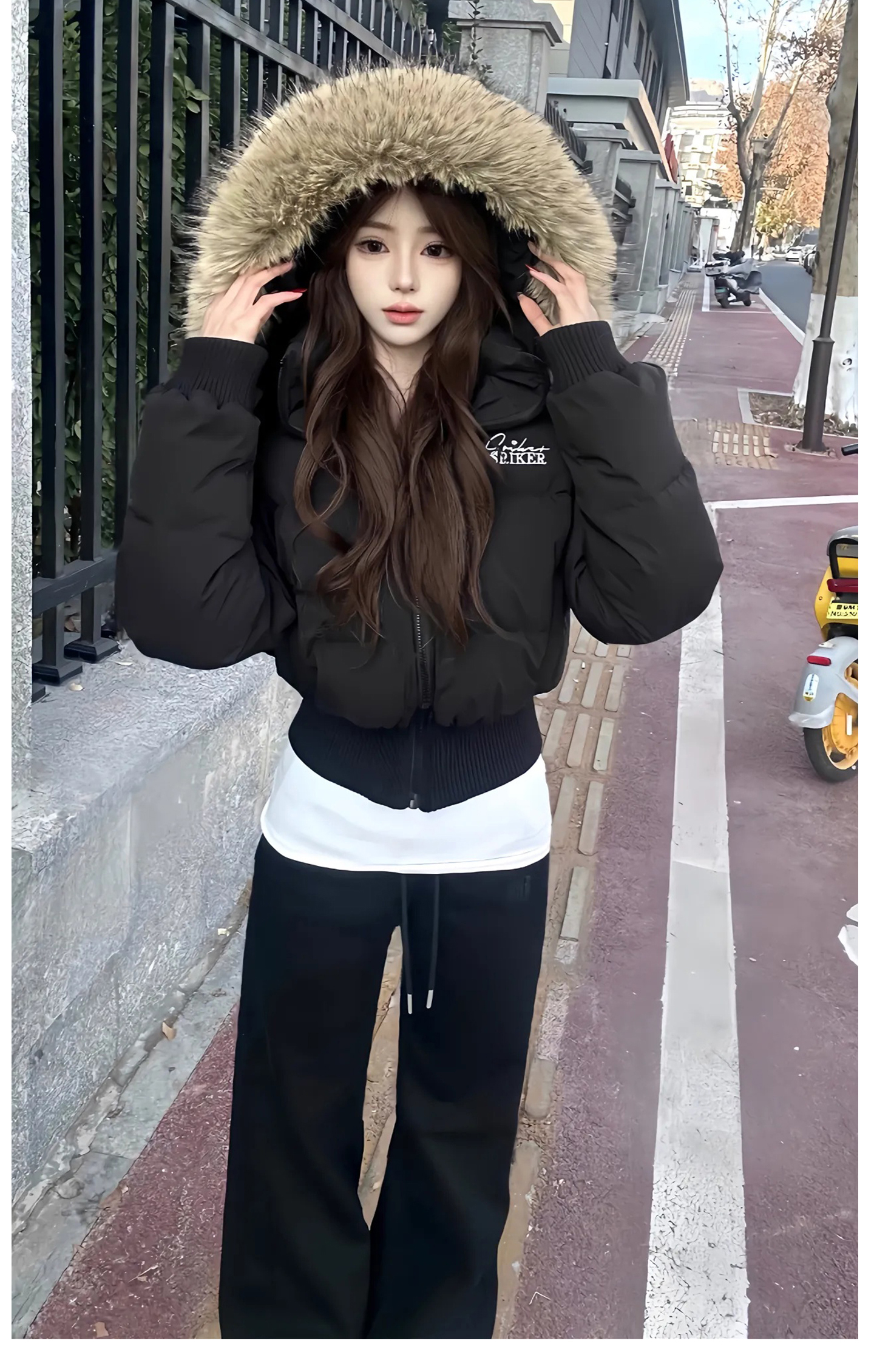 >> 黑色短款大毛領連帽羽絨棉服女冬季2025新款保暖收腰顯瘦棉衣棉襖