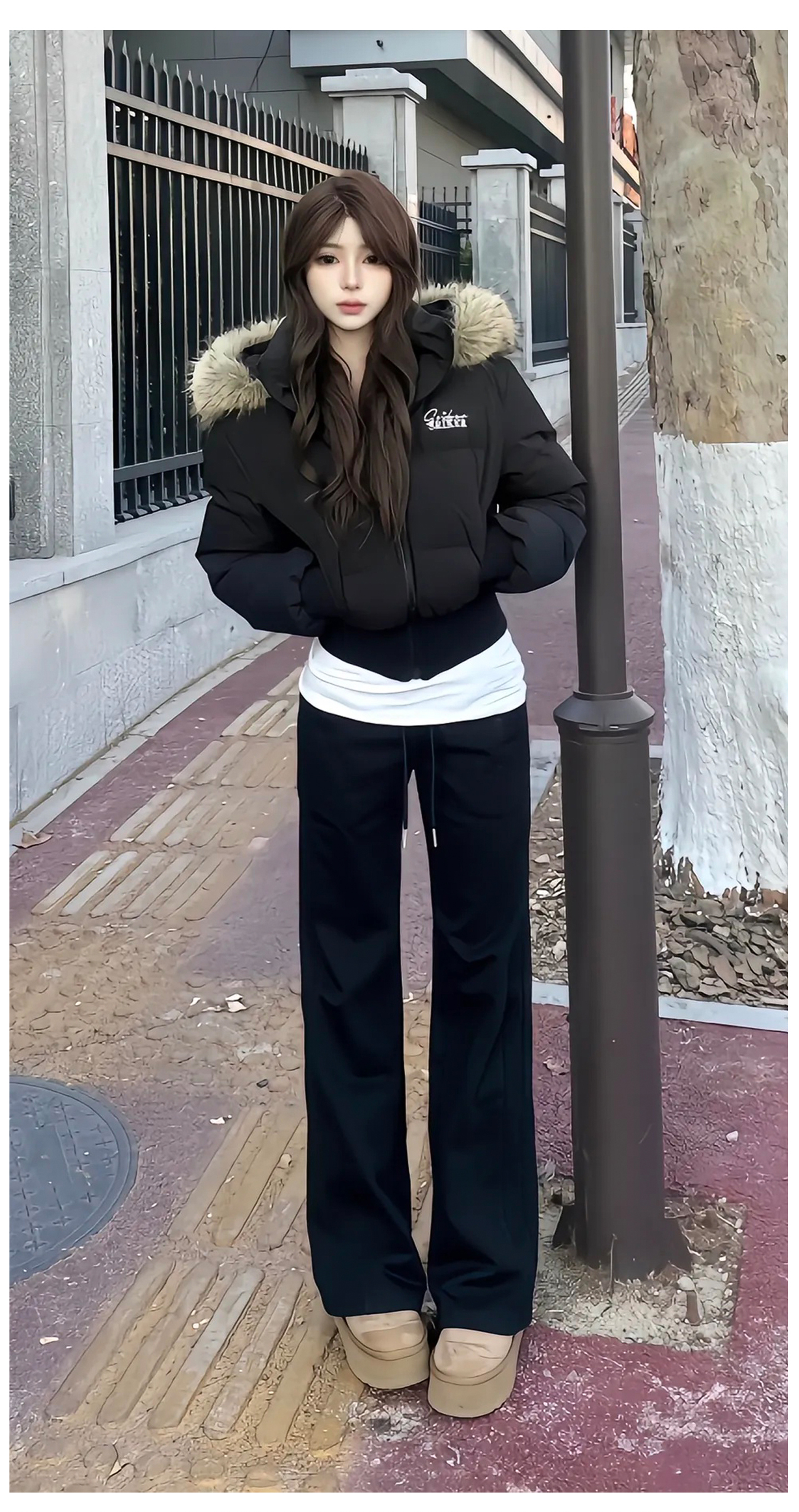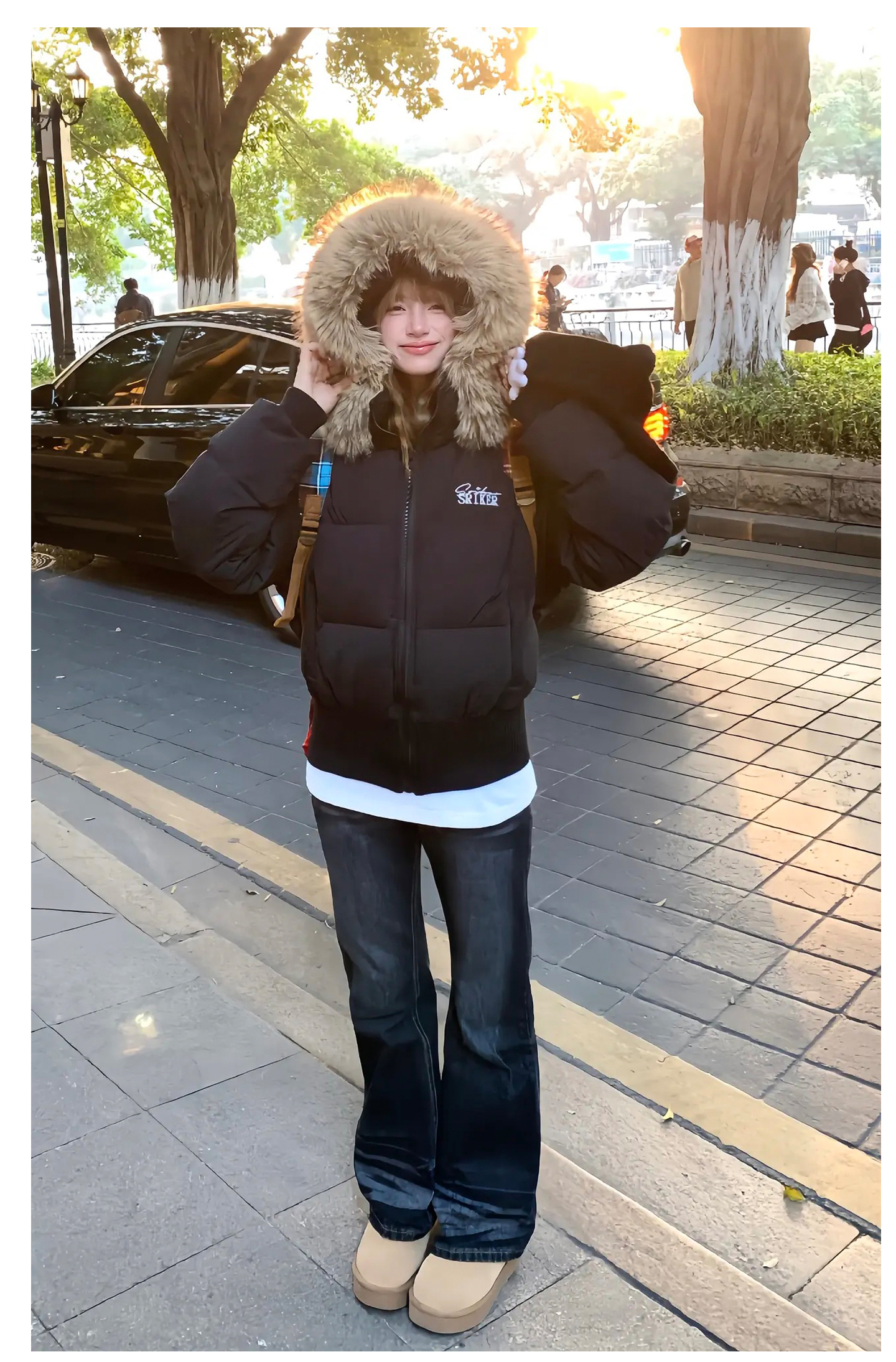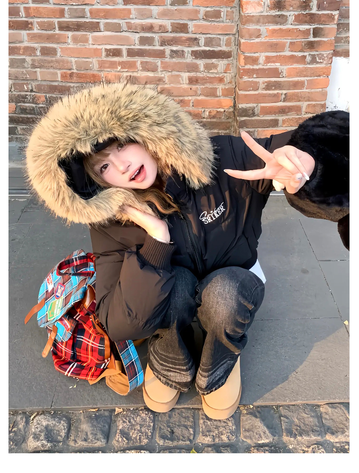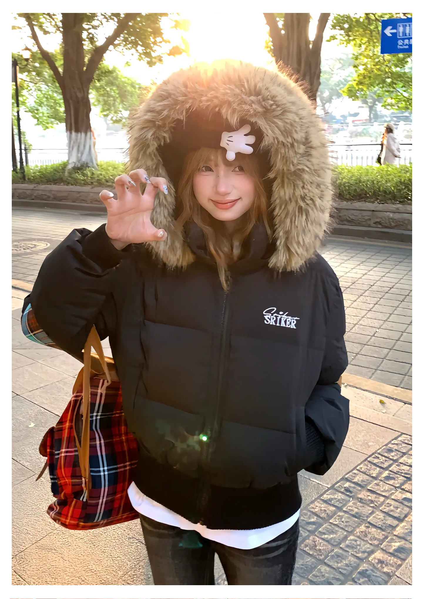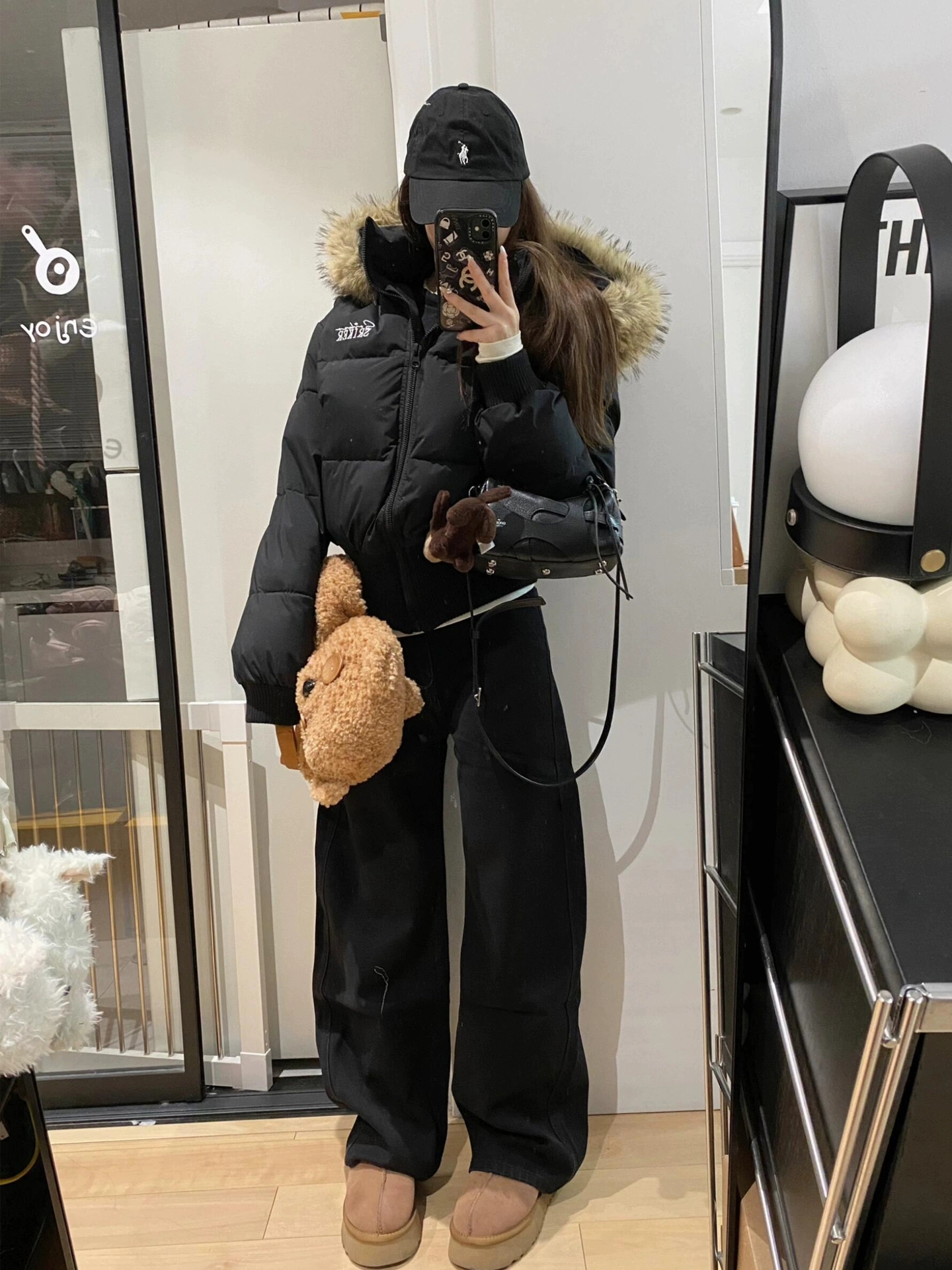 >> 黑色短款大毛領連帽羽絨棉服女冬季2025新款保暖收腰顯瘦棉衣棉襖