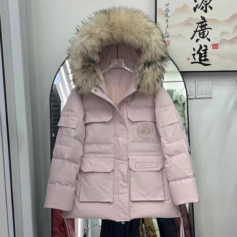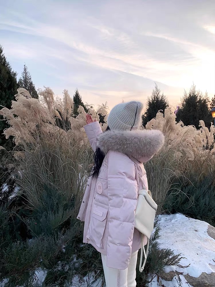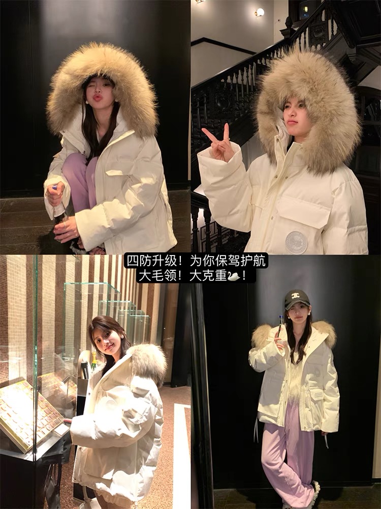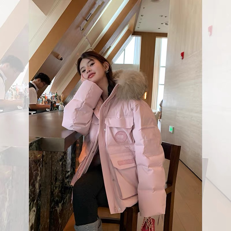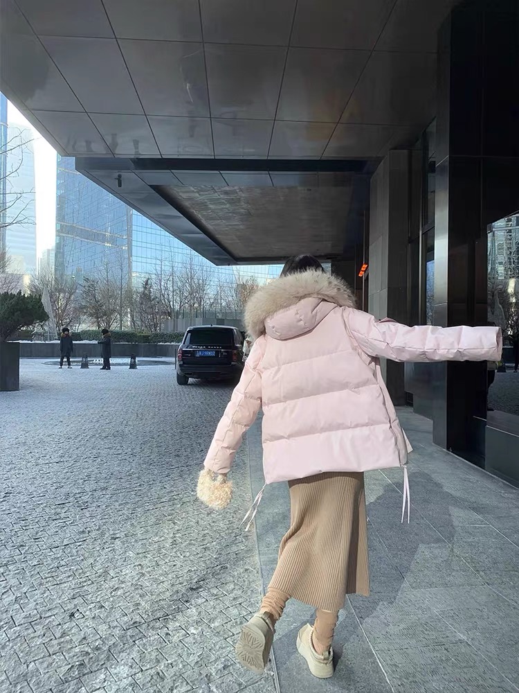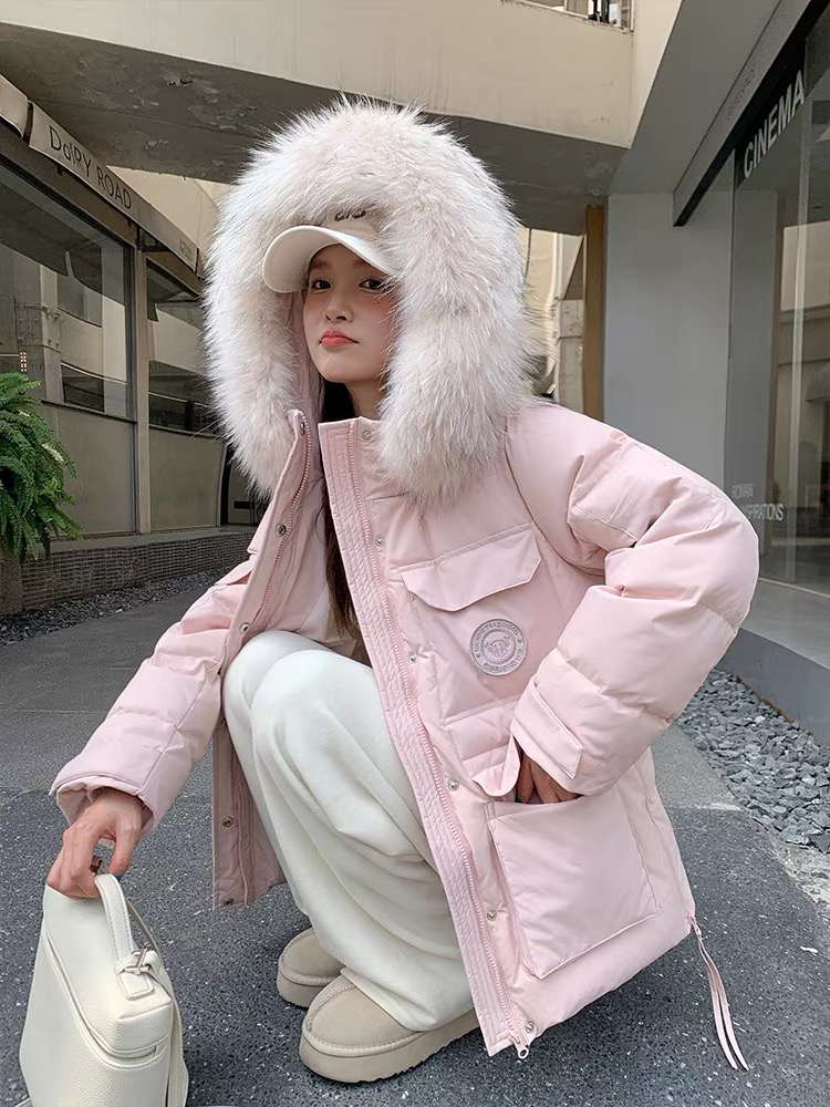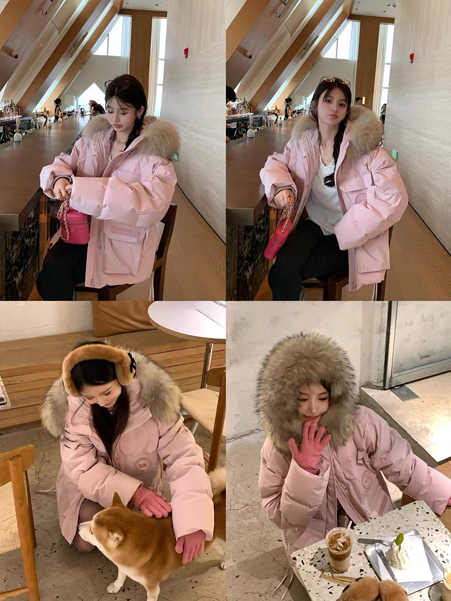 >> 2025丹麥之冬極寒女短款加厚大毛領粉色工裝派克服韓版羽絨棉服女