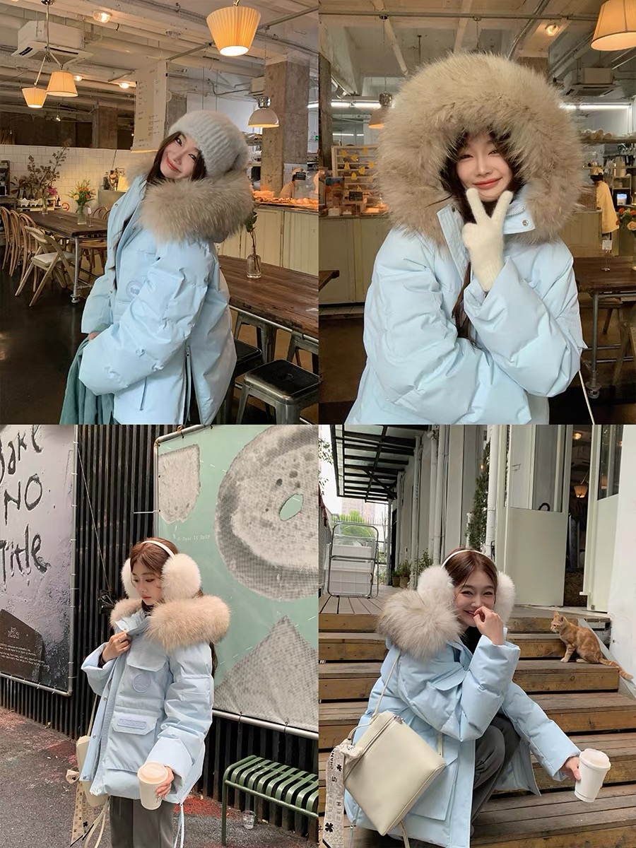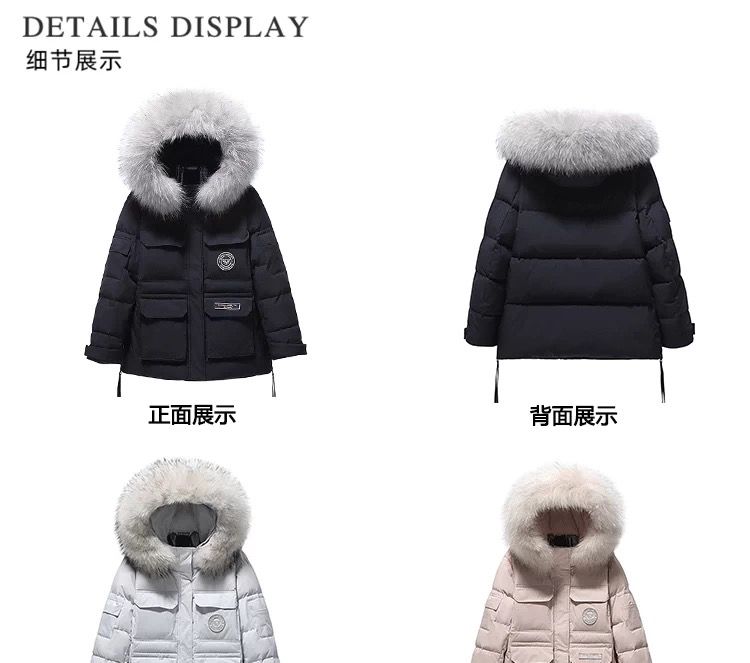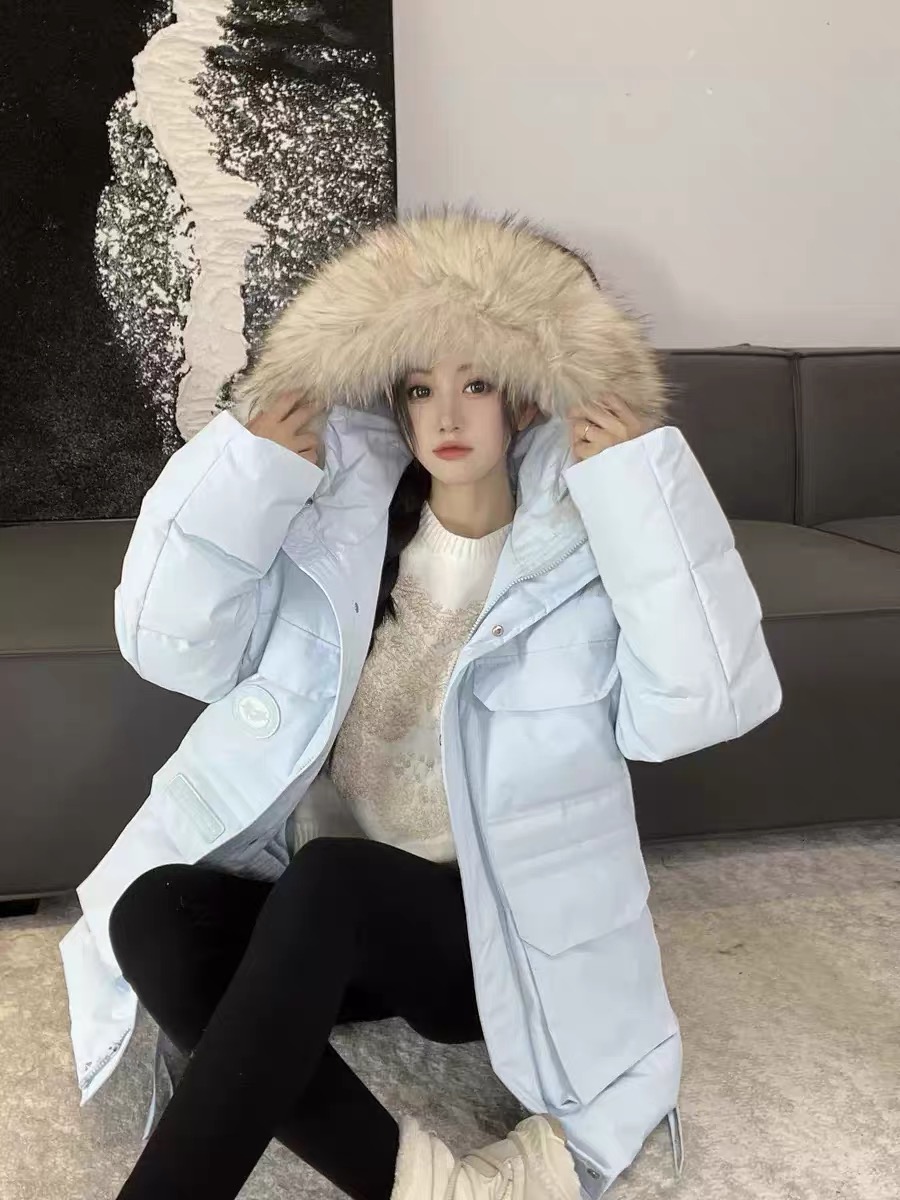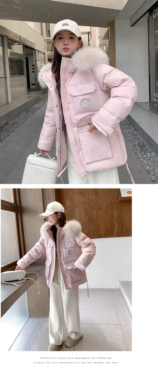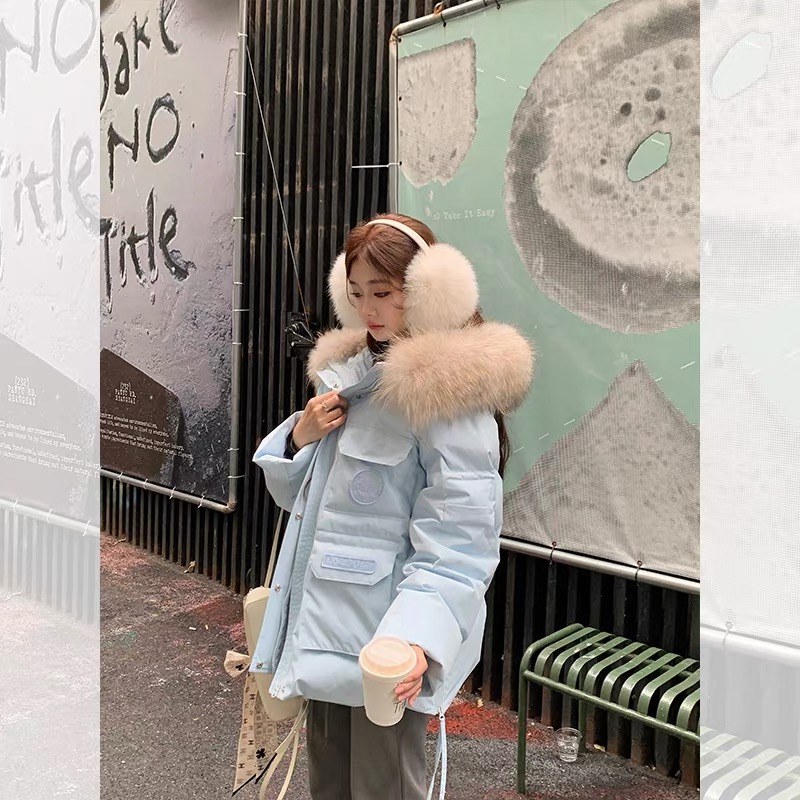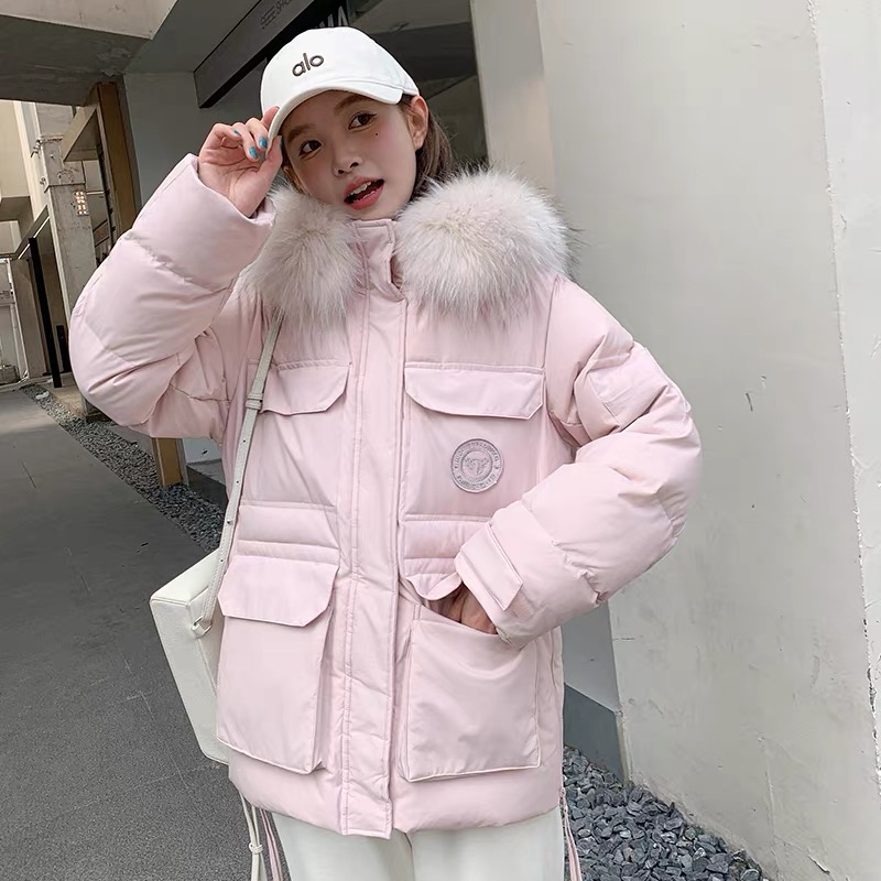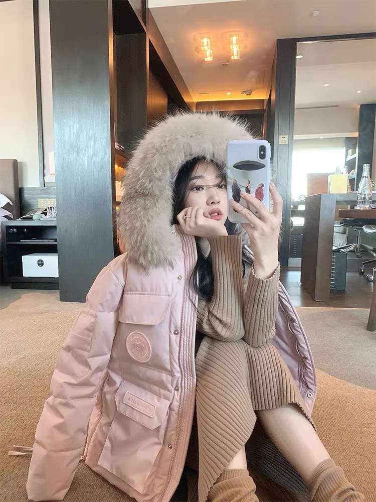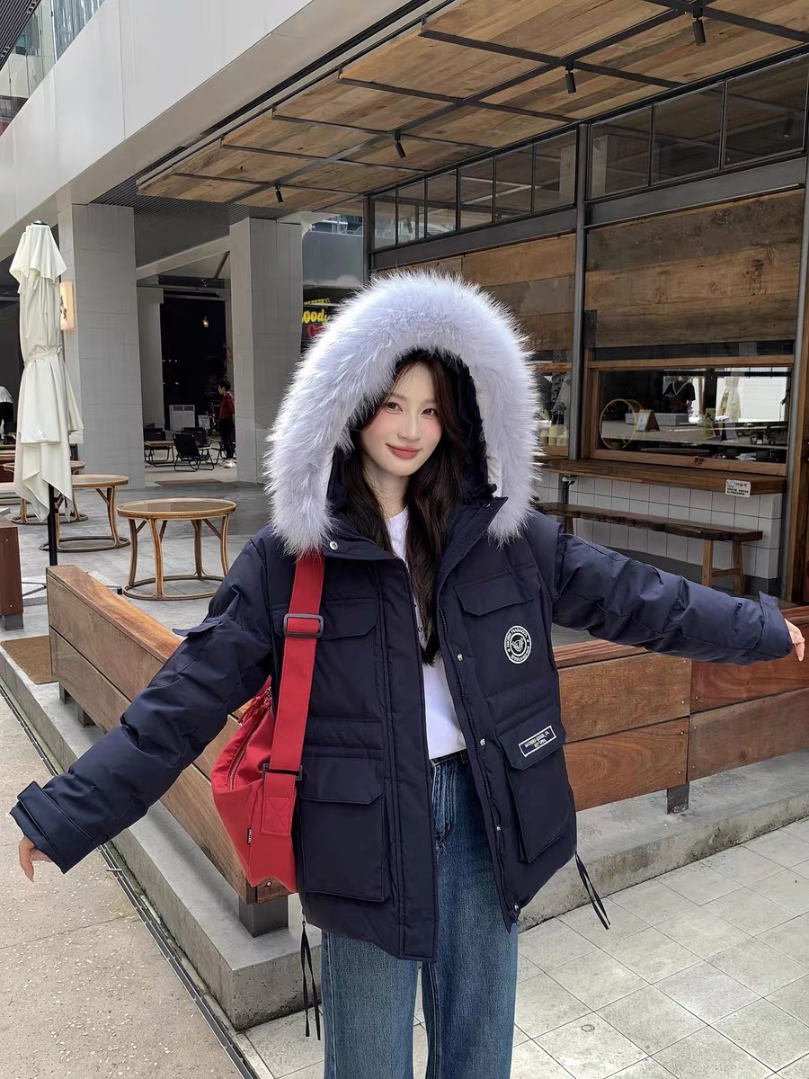 >> 2025丹麥之冬極寒女短款加厚大毛領粉色工裝派克服韓版羽絨棉服女