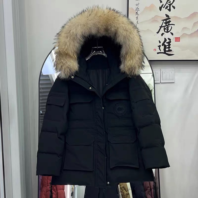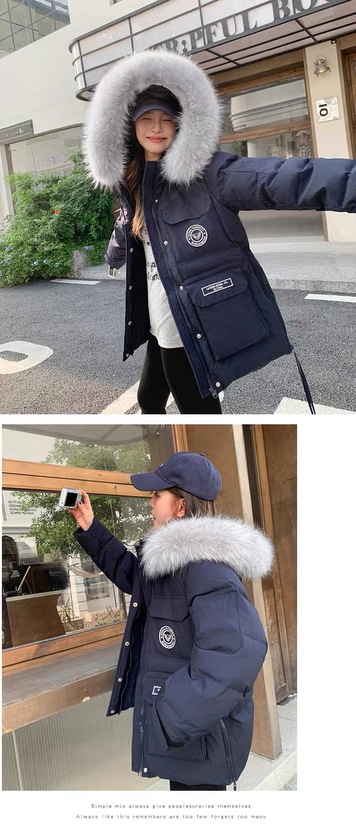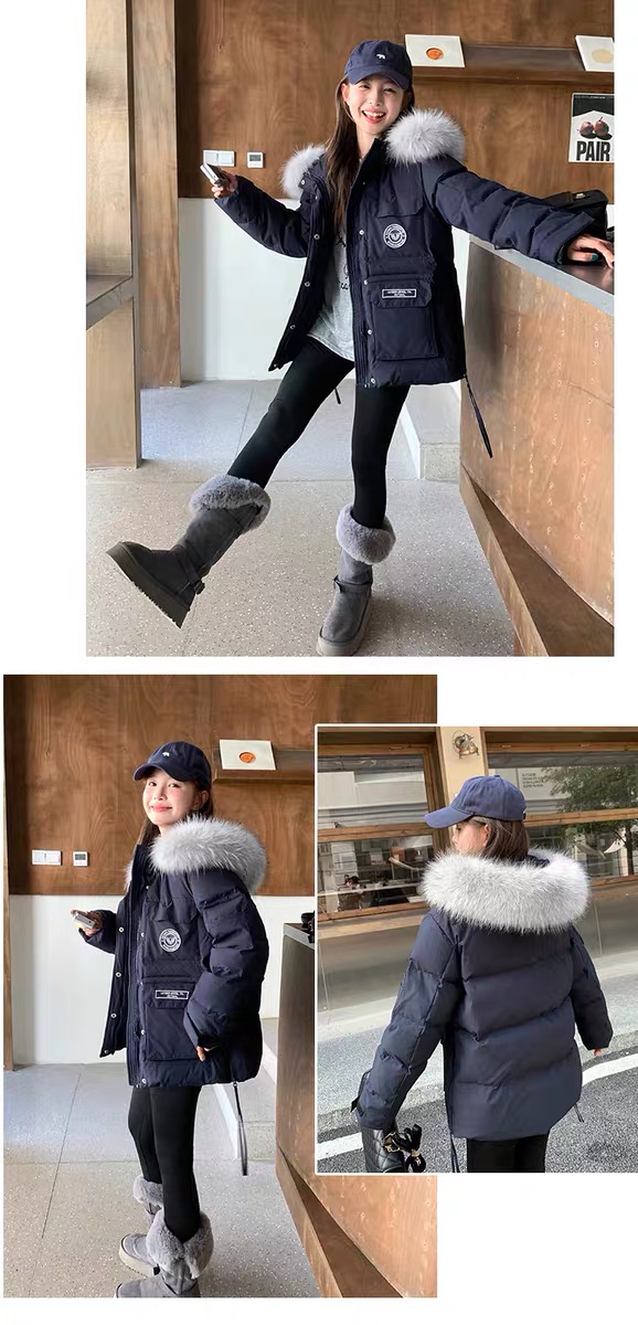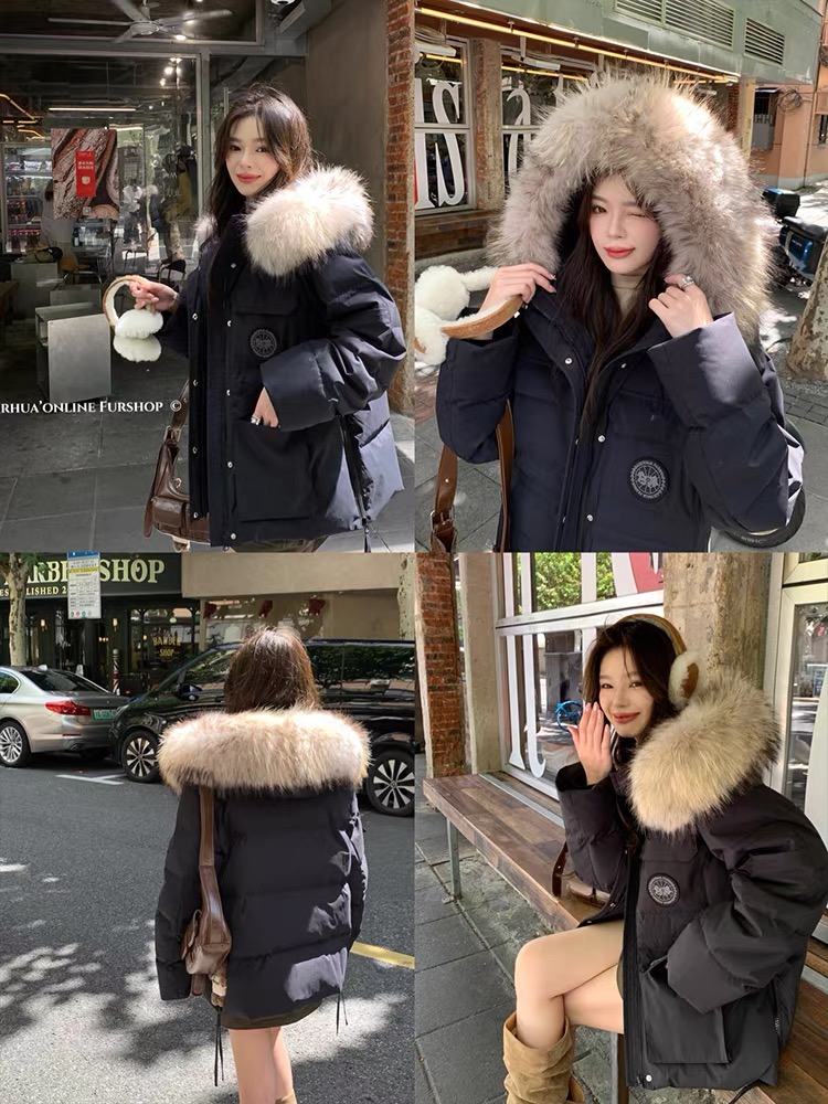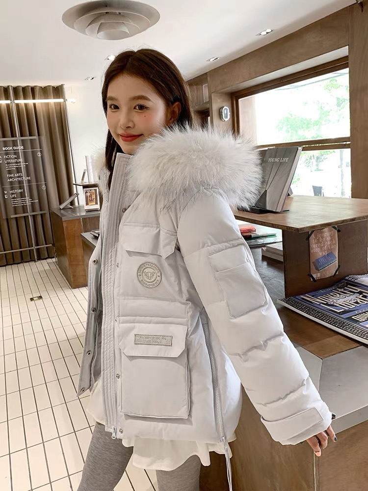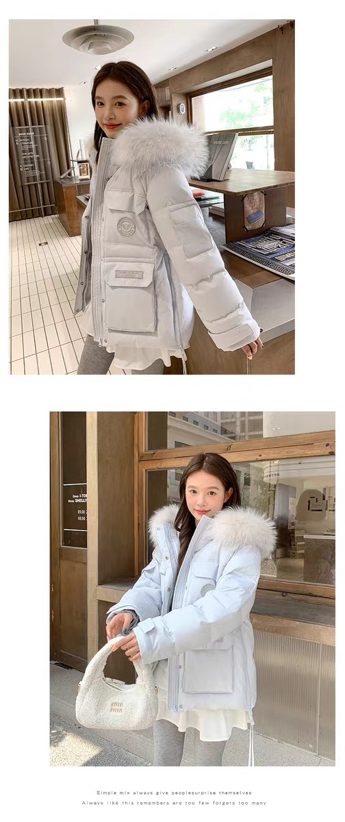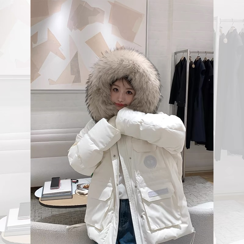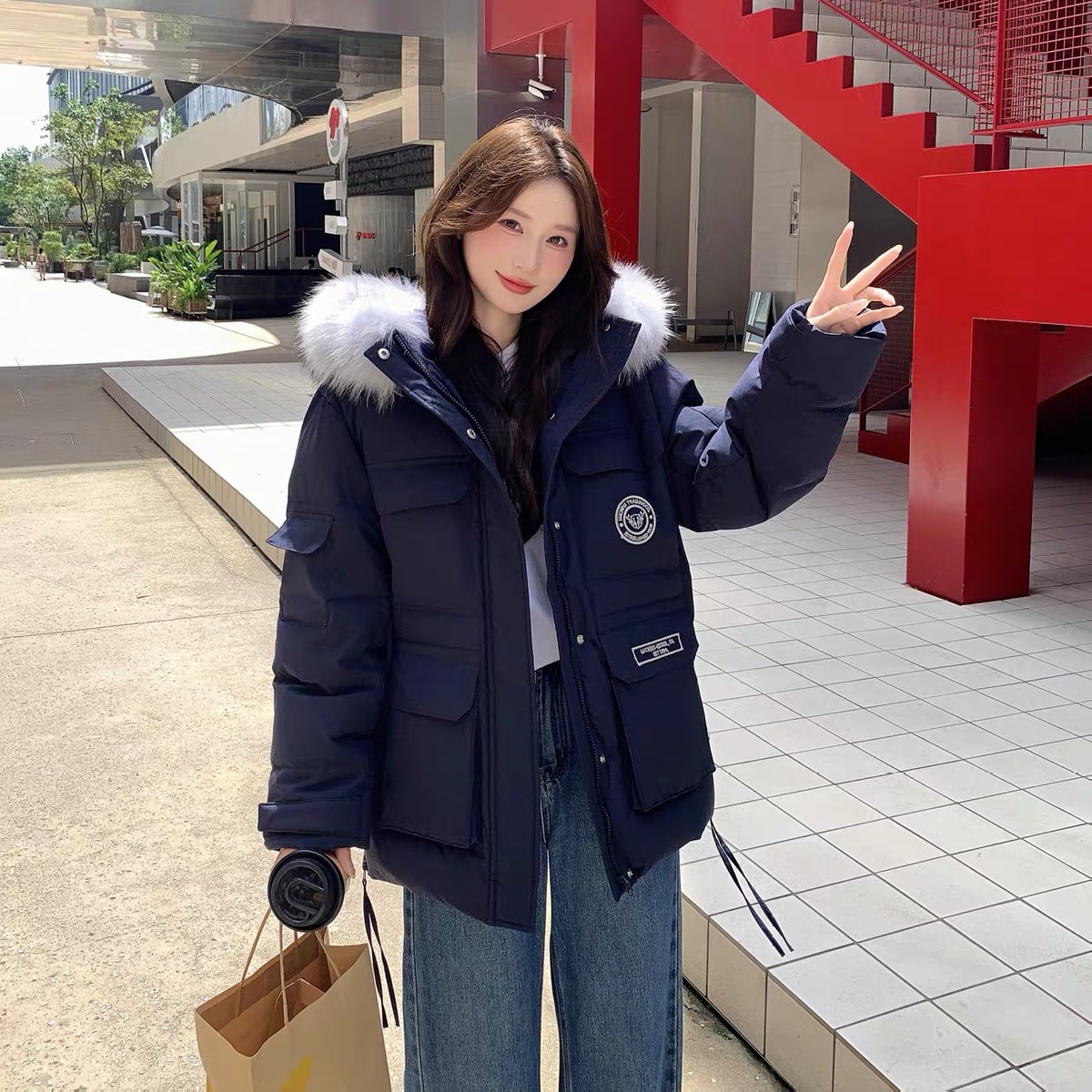 >> 2025丹麥之冬極寒女短款加厚大毛領粉色工裝派克服韓版羽絨棉服女