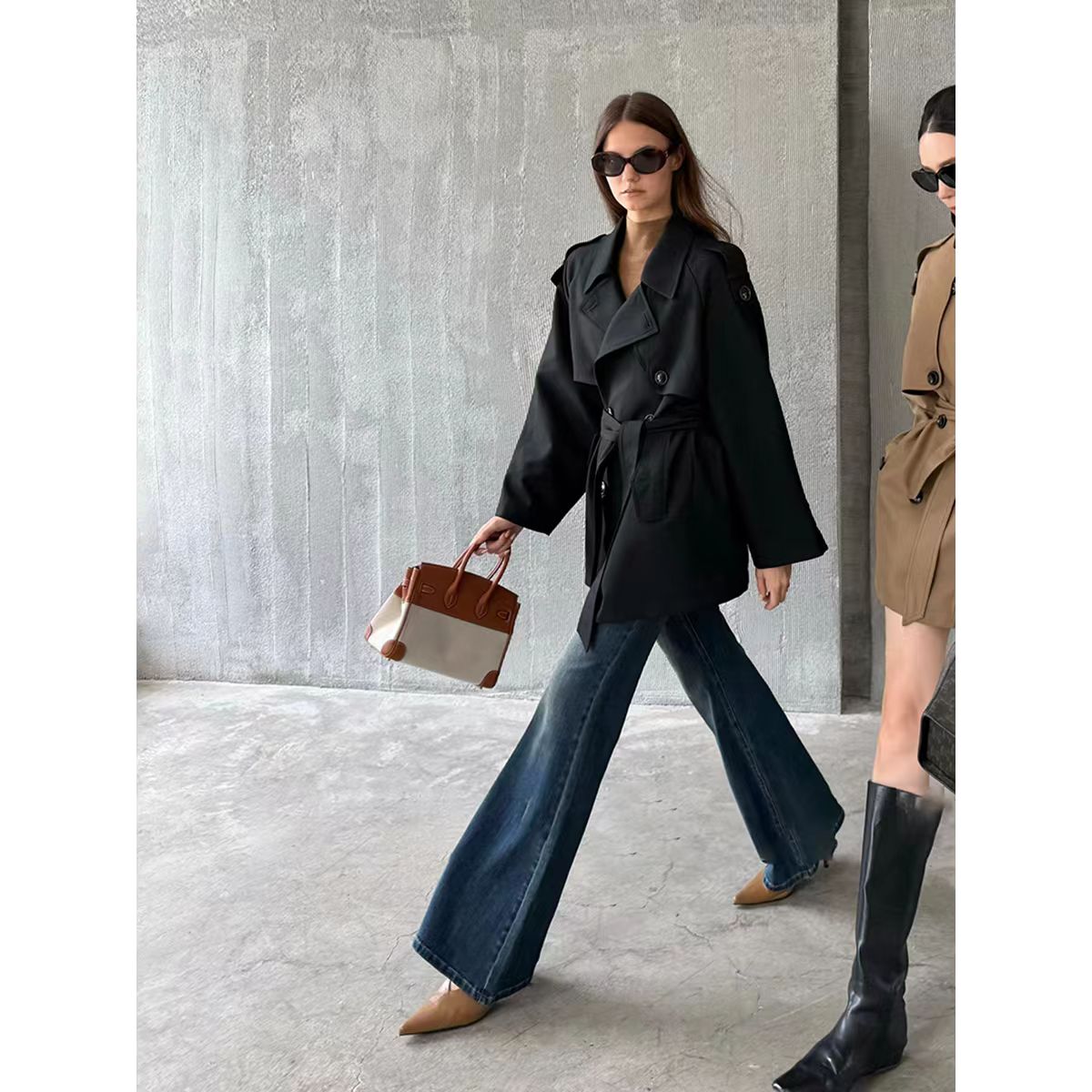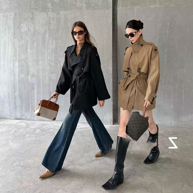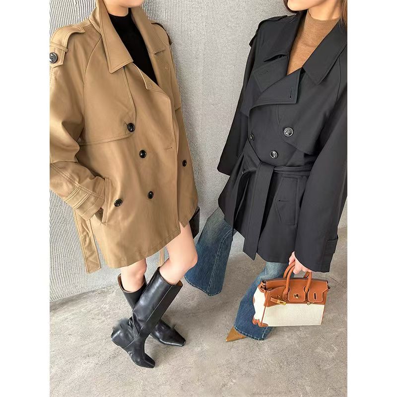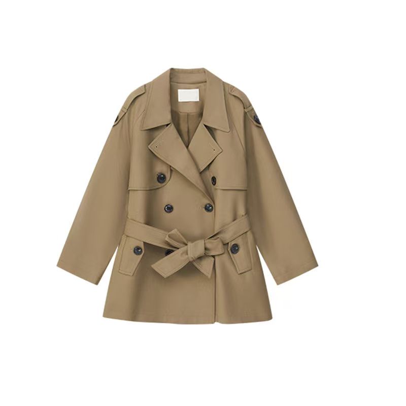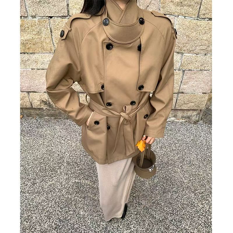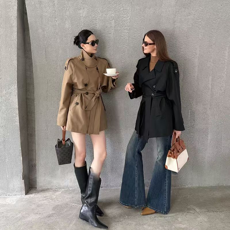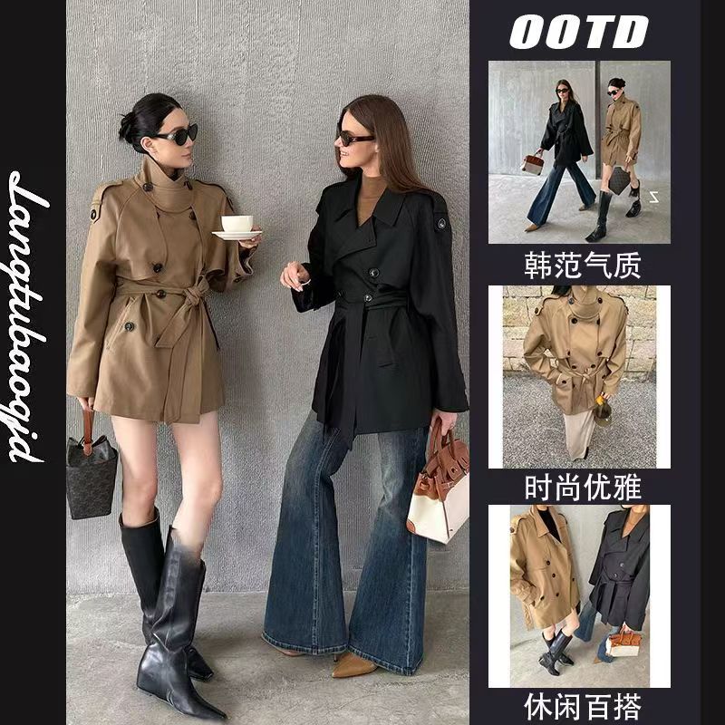 >> 韩系新款百搭时尚经典廓形翻领收腰短款风衣外套女2025秋季小个子