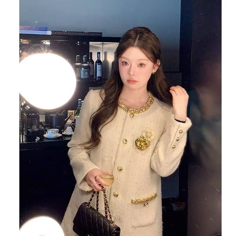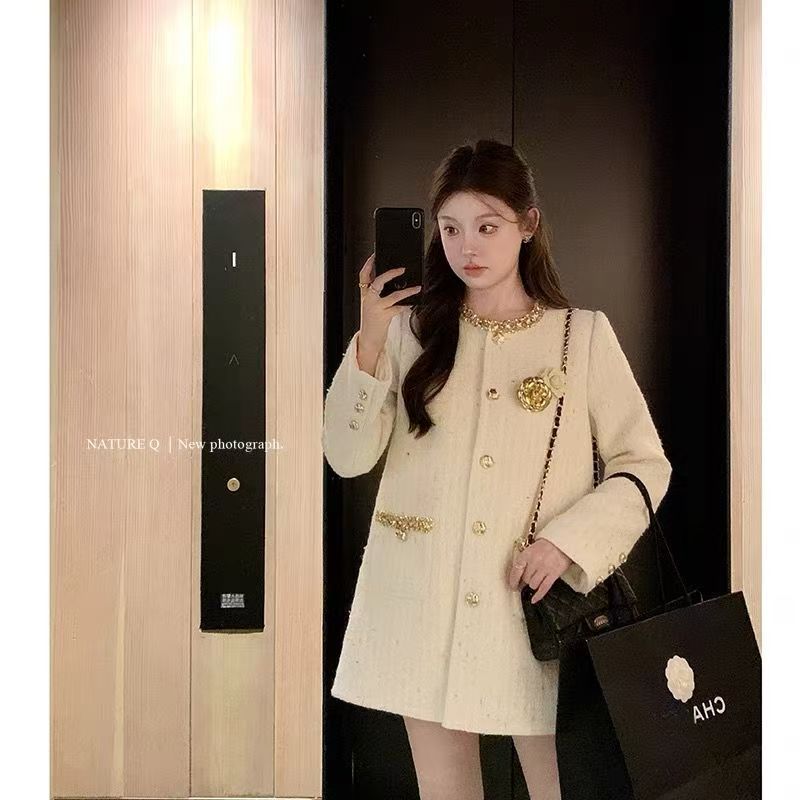 >> 配花朵小香风外套女中长款夹棉百搭长袖洋气减龄显瘦网红百搭外穿
