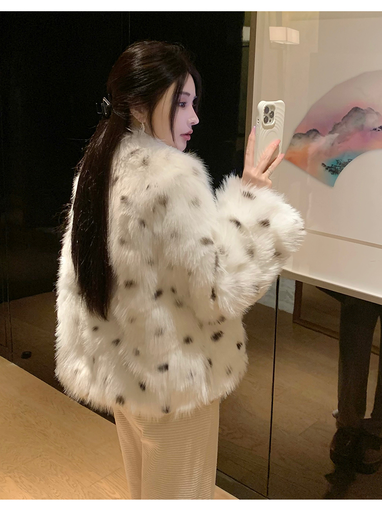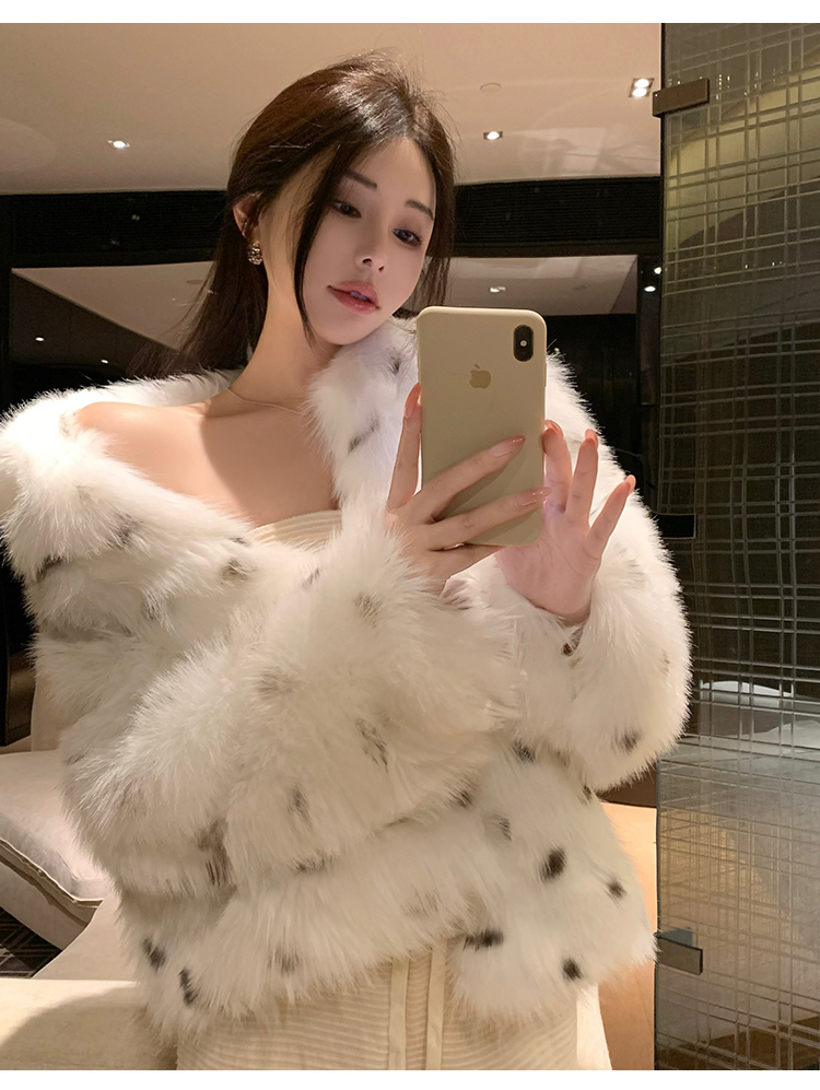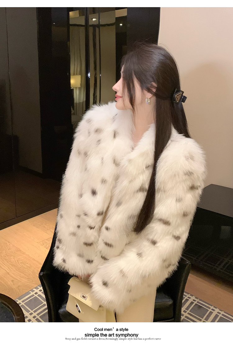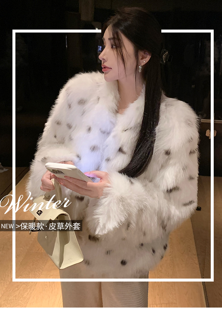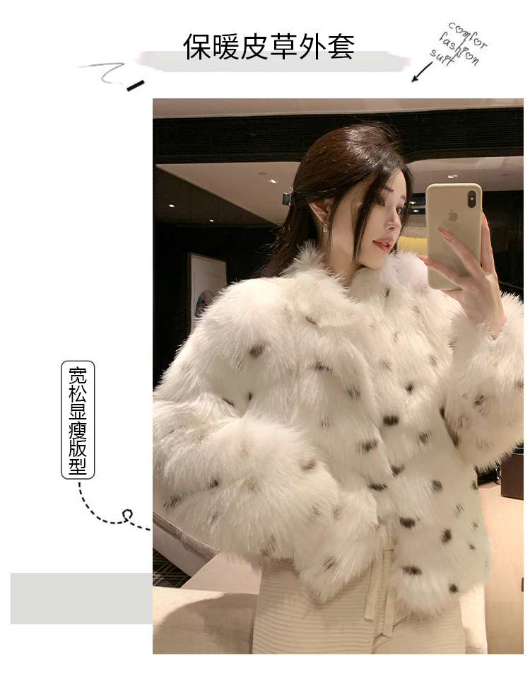 >> 实拍韩版环保皮草翻领仿狐狸毛重工豹纹皮草外套新款女毛毛年轻款