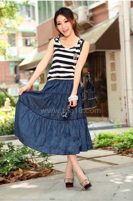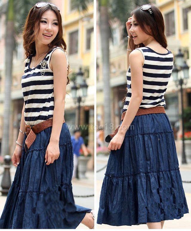 圓領無袖條紋韓版拼接牛仔長裙背心連衣裙配腰帶