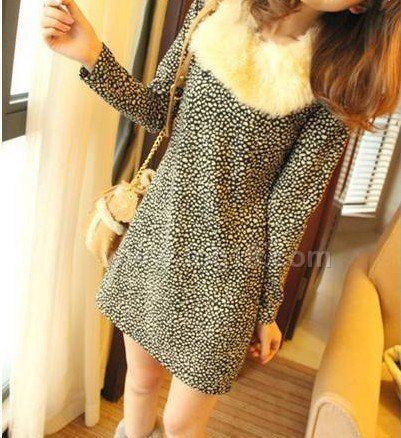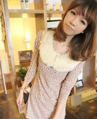 可拆卸毛領 小豹紋連衣裙(二色)