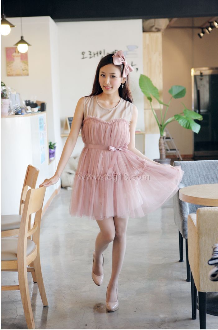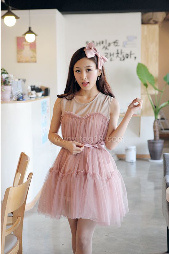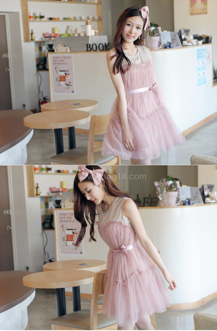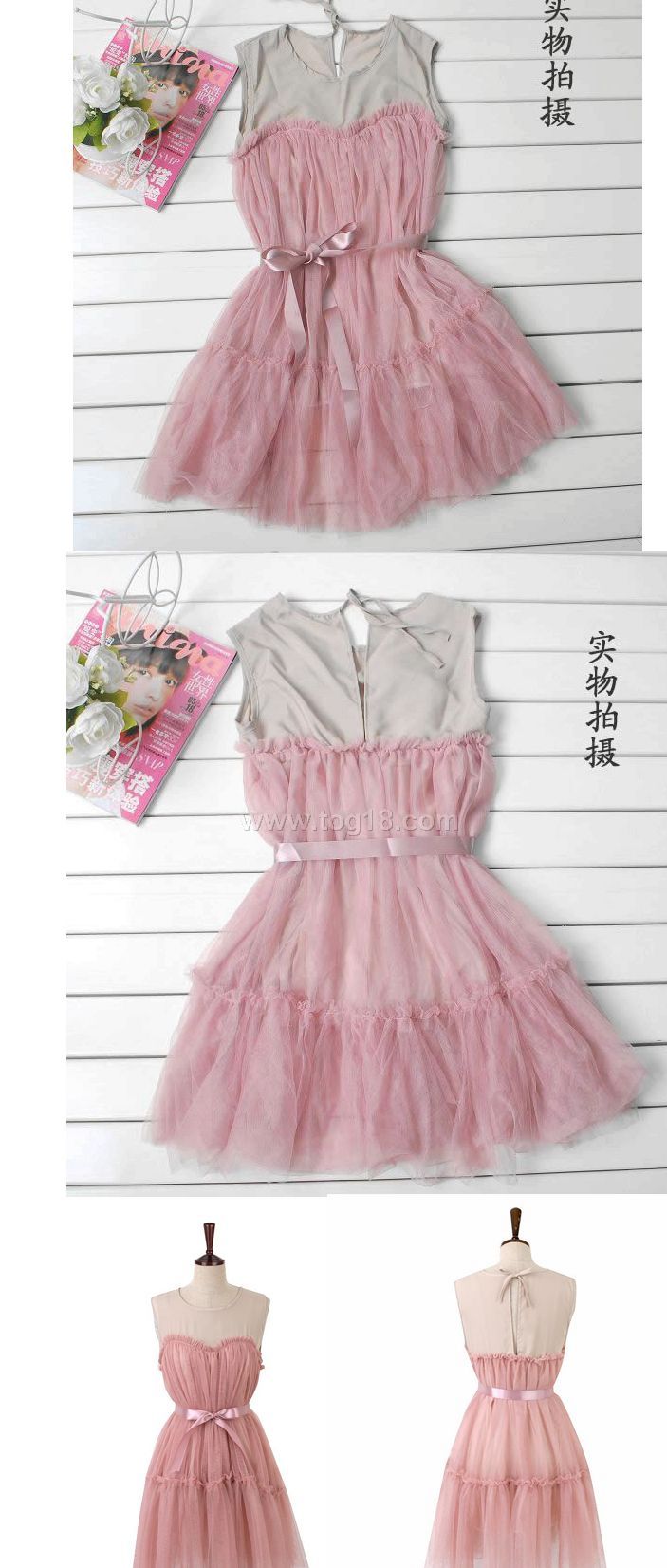 款式說明: 漂亮的公主網紗裙.淡淡的藕粉色,實物與圖片毫無色差,腰間配絲帶收腰,喜歡公主風的MM不要錯過哦~
