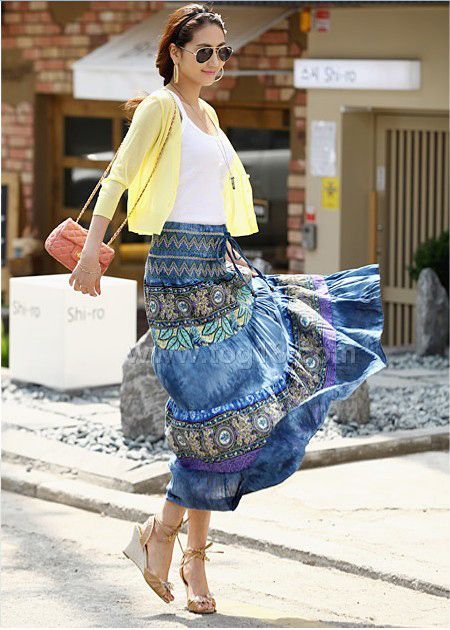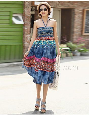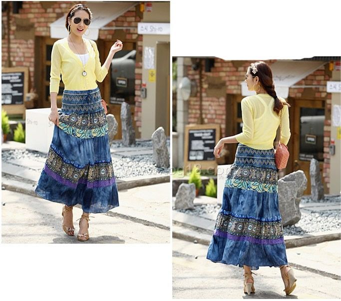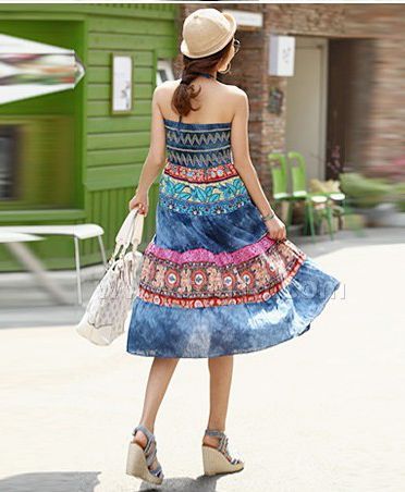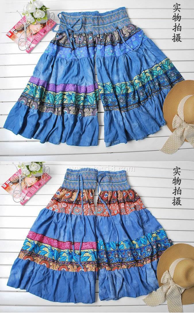 式說明:民族風特色的波西米亞長裙,採用薄牛仔棉+花布接拼縫製,奪目的色彩感,可作兩穿.兩色選擇,夏日休閒度假的必選裝束~