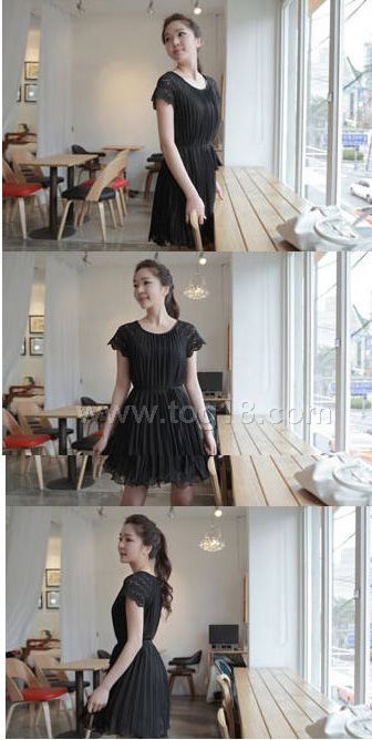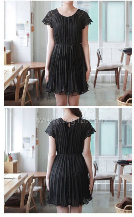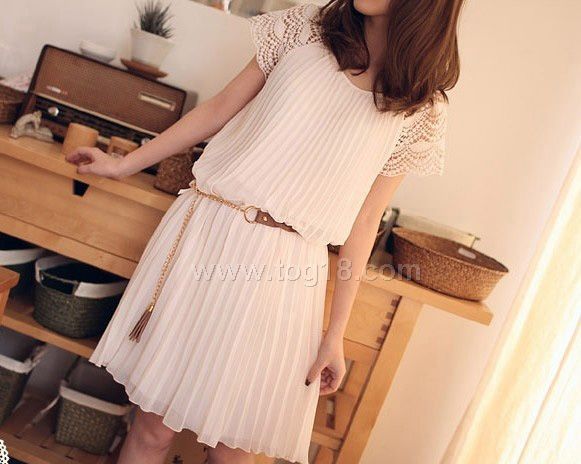 鏤空花邊袖百褶連衣裙+腰帶