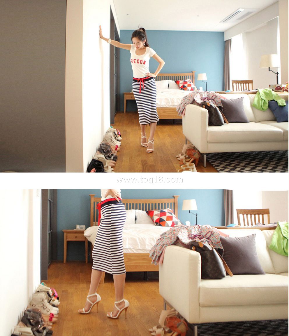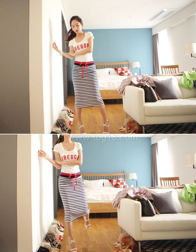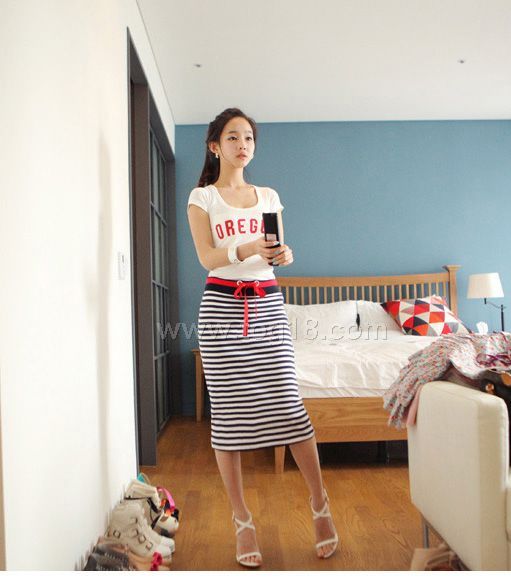 最新百搭清晰條紋套裝T恤+裙子