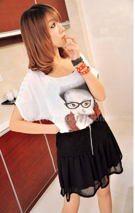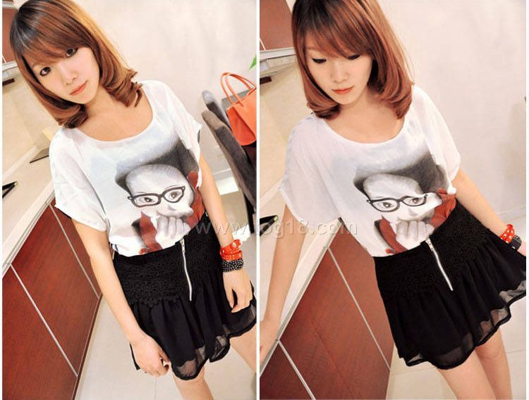 美女圖案條紋雪紡拼接寬鬆型蝙蝠衫