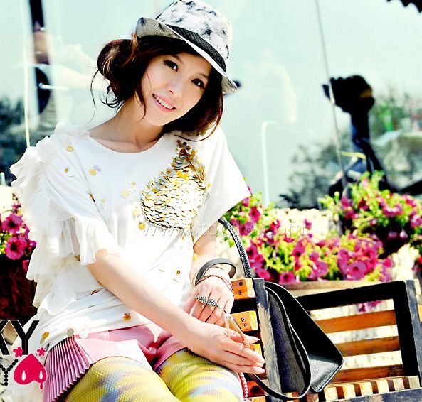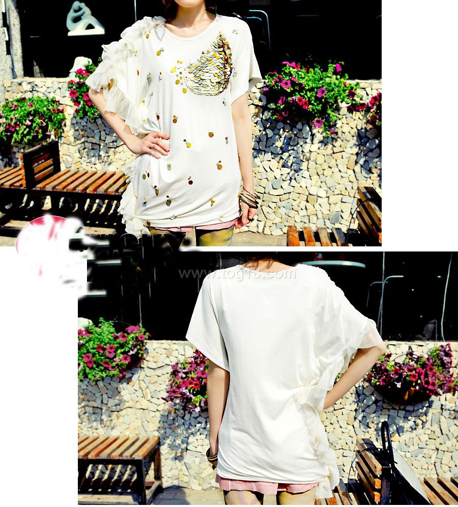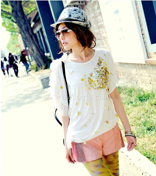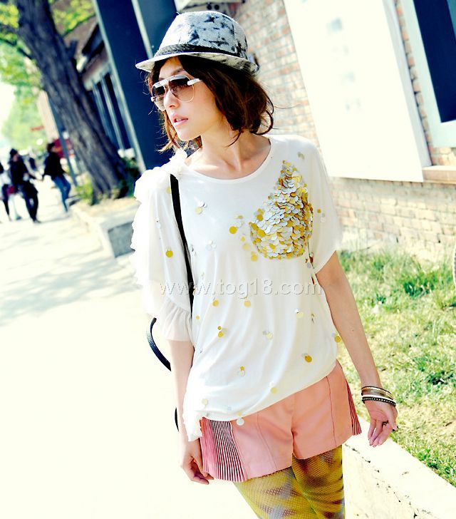 唯美的少女清甜風格,和初夏的柔和體驗相當融合。不規則蜿蜒流動的荷葉邊點綴,走起來蹁躚、輕盈、靈動、灑脫!純淨的底色,搭配金銀色的圓片天使之翼的造型,以及隨意點綴T恤之上的亮片,是這款T恤的精髓所在!荷葉邊處理,透露少女的芬芳氣質,結合blingbling的亮片片,組合而成的波浪裝飾圍邊,爛漫唯美調調便貌不客氣地席捲而來,猶如初春田園一般的輕盈步調讓人感受愉悅的心情。唯美的精靈風格是各大巴黎、米蘭時裝周上走秀品牌最鍾情的HF時尚風格,實物更勝一籌,想不愛都難!還等什麼呢?趕快入手吧!氣質款推薦呢!!