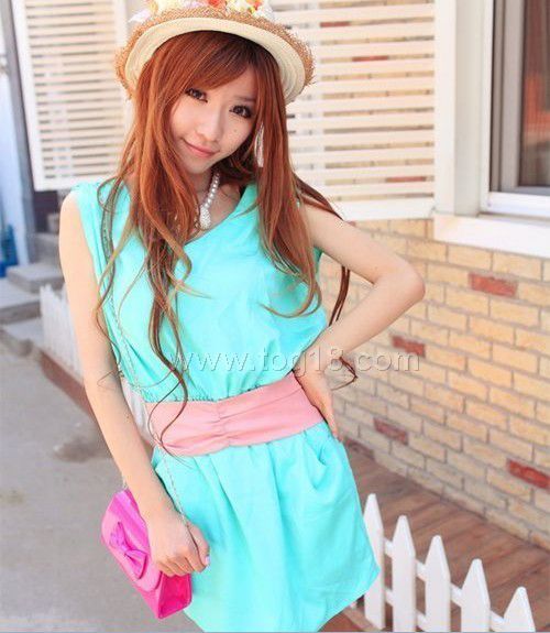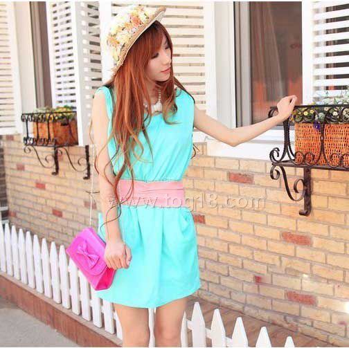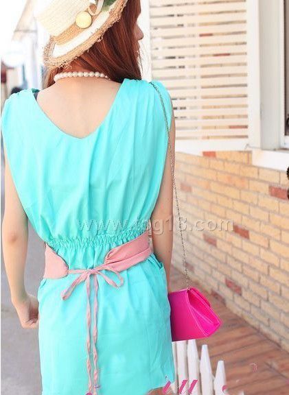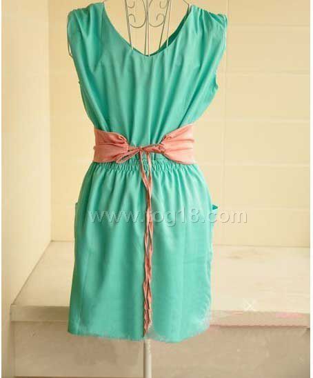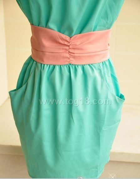 2011新 夏季 拼色 休閒款 口袋 雪紡 連衣裙 送腰帶