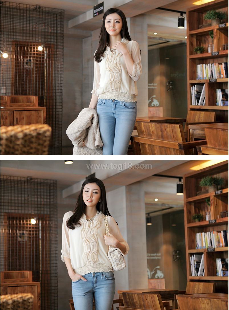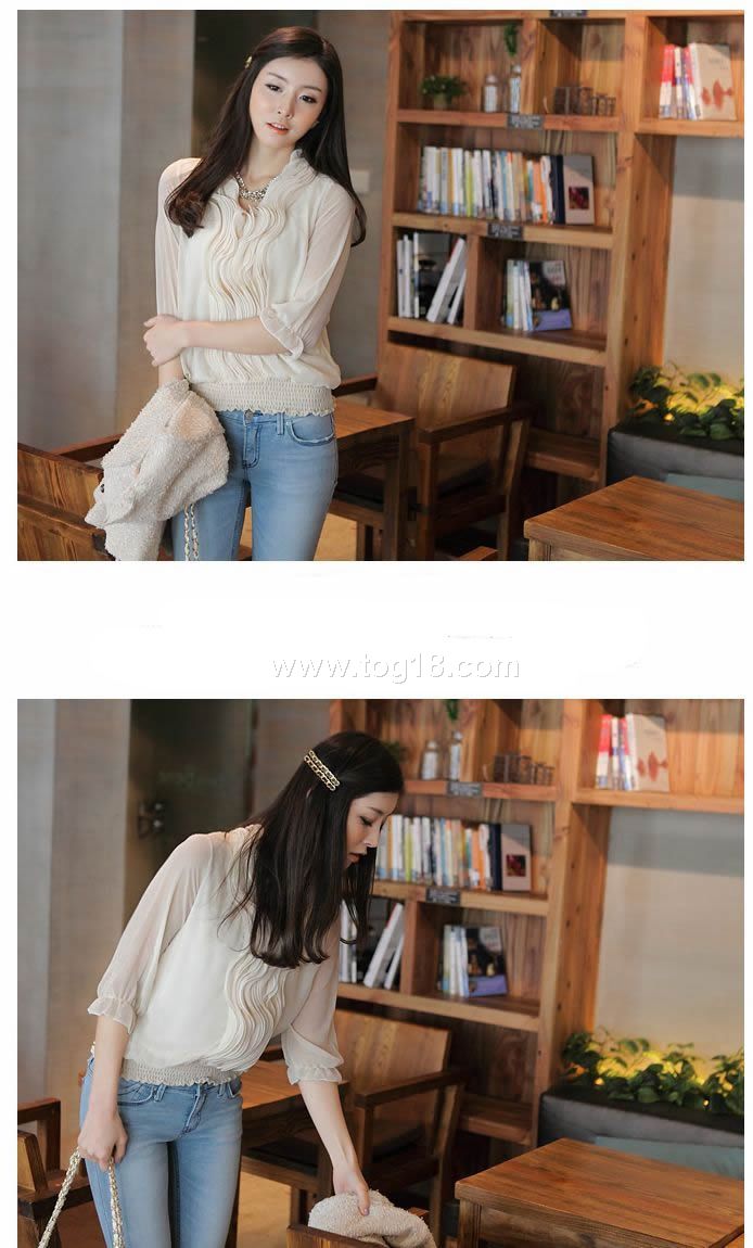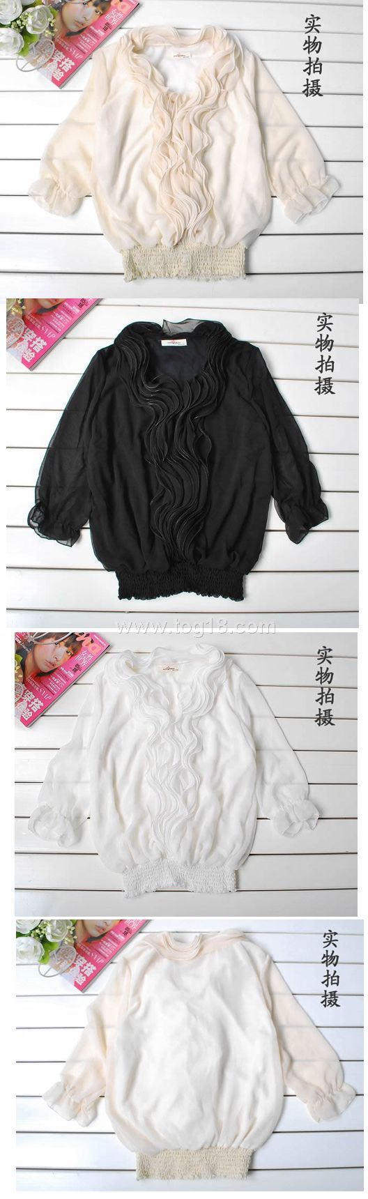 款式說明:很百搭的淑女款襯衫,均碼尺寸,領型層疊木耳領設計,下擺及袖口用彈力橡筋修飾,三色選擇,面料採用仿真質材.質感柔軟.兩層栽剪,夏日淑女風的百搭款!!