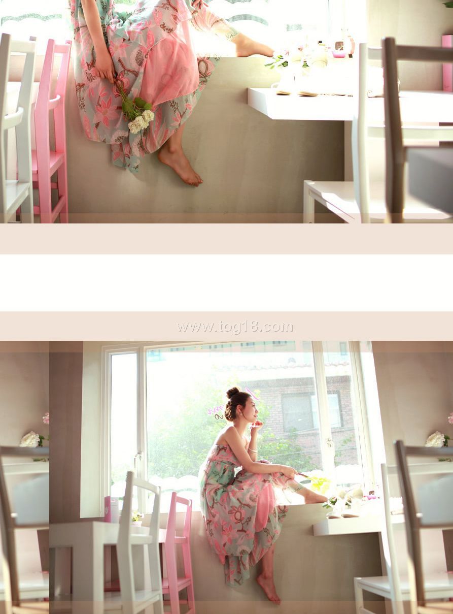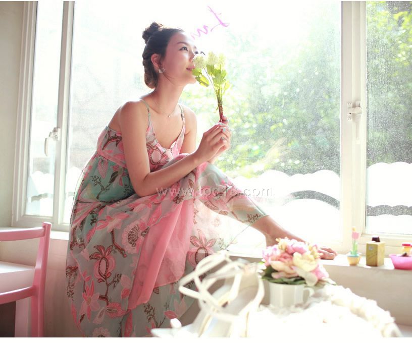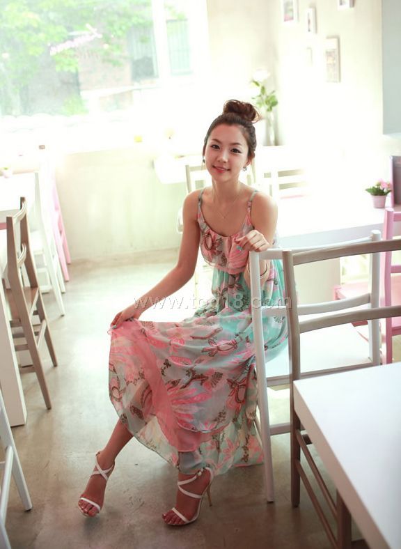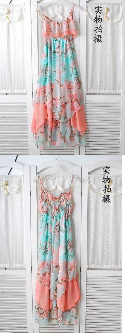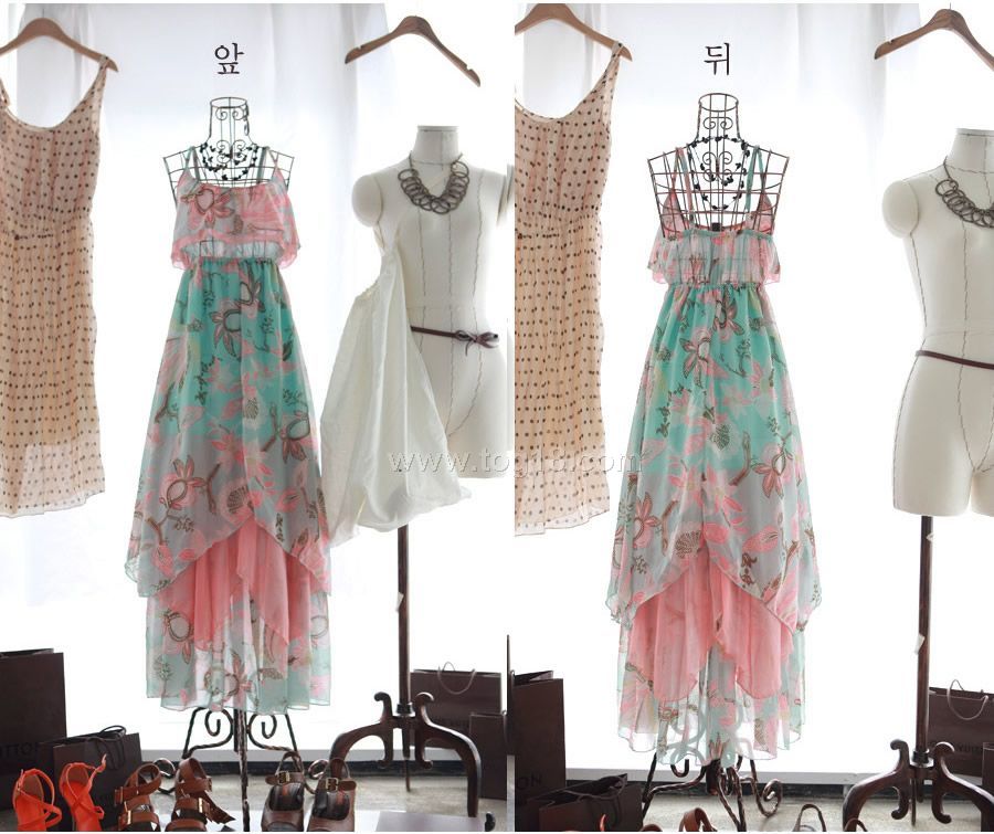 款式說明:時尚的少女園田風,流行的大花朵圖案印花,漸變色系與配色的設計,瑰麗的色彩,超大的裙擺.肩帶可調節長度,今夏不能錯過的流行風.