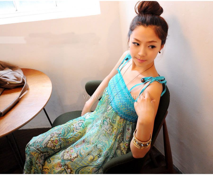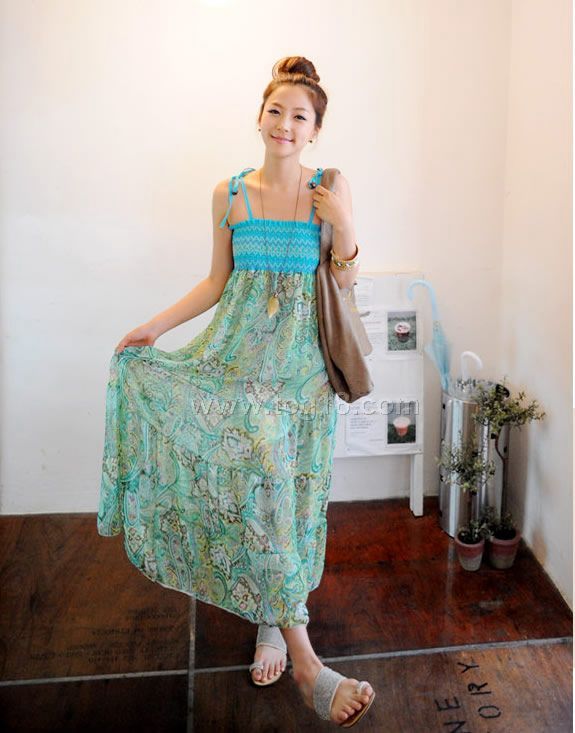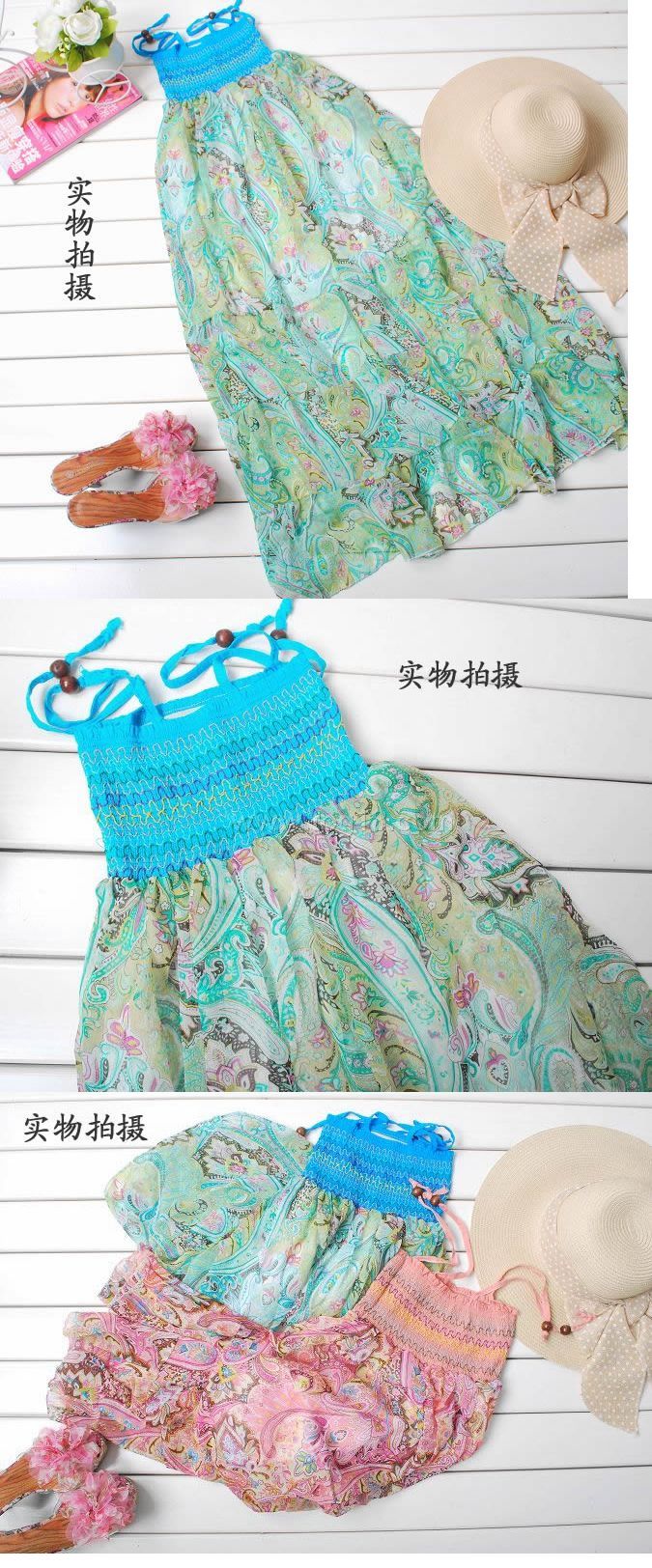 款式說明:今季流行的雪紡質材印花裙.胸部彈力橡筋設計,肩帶長短依個人身高調整,兩色選擇,浪漫的波米風情.少女風盛夏的必殺產品.