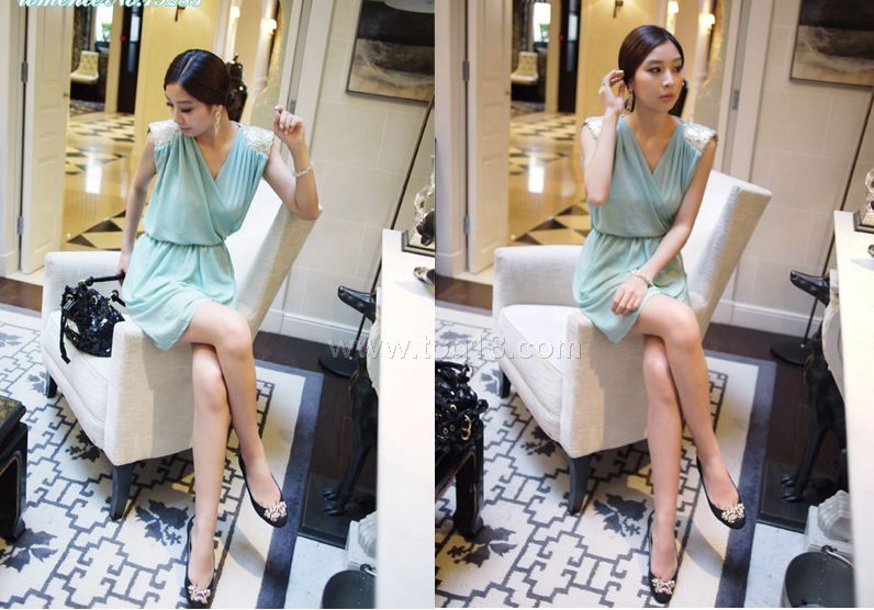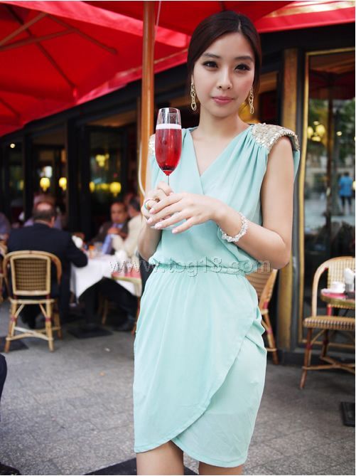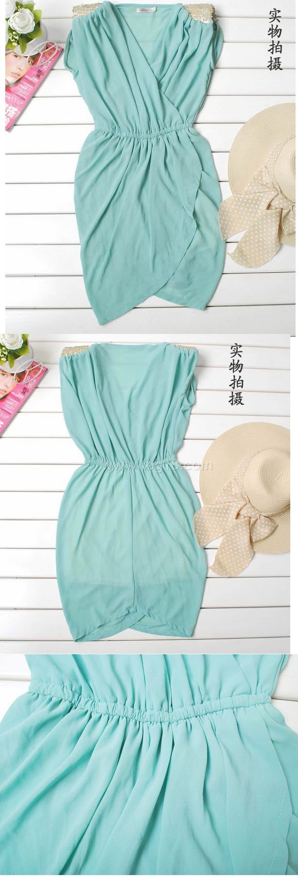 款式說明:優雅的名嬡氣質,淡淡的薄荷色,金色的亮片墊肩設計,稱托整體的亮點,腰部設彈力橡筋,質材富垂墜感,均碼尺寸,小V領口,上身效果女人味十足.