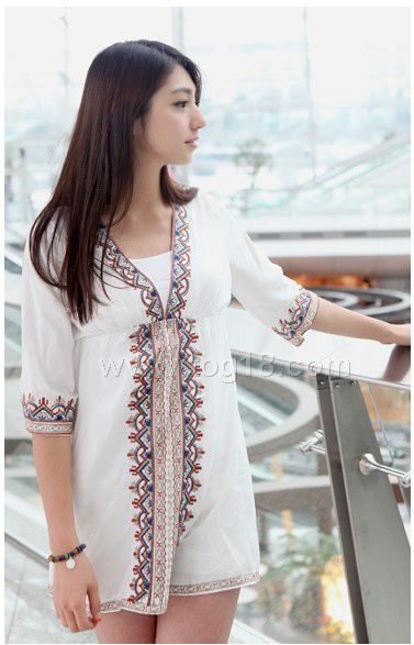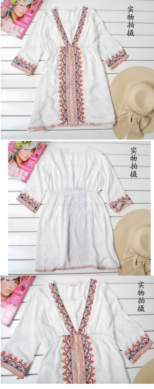 款式說明:簡潔的淑女風.今季流行的彩色繡花圖案,修身的剪栽,均碼設計,質材面料不透明,比本廠所有繡花系列襯衫款略厚,領口至下擺多處重工繡花,胸圍至後腰有鬆緊橡筋.胸圍張大較大,設計容入民族風特色,是夏日混搭的一款簡潔淑女襯衫裙.