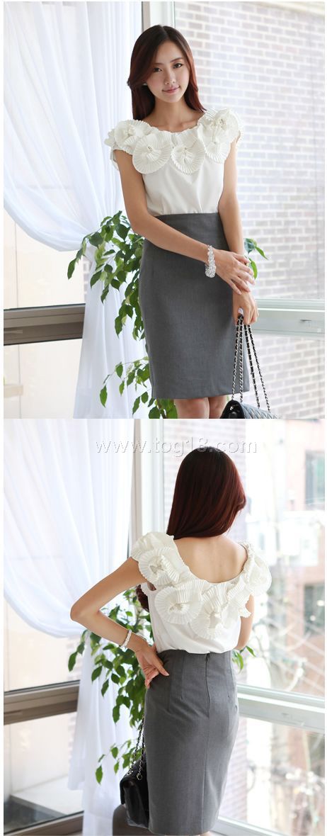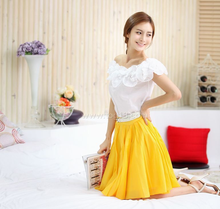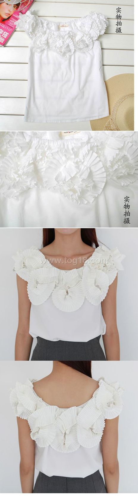 款式說明:一款很特別的皺褶領襯衫,領口環繞的皺褶花邊設計獨特,彈力橡筋的領口.可作露肩款穿,均碼尺寸,面料質材有一定彈力,夏日多種混搭穿法的淑女裝備.