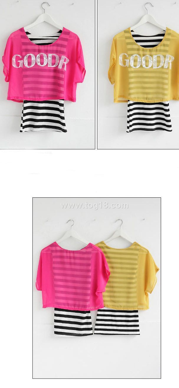 夏裝新款 韓版淑女假兩件橫條雪紡字母上衣