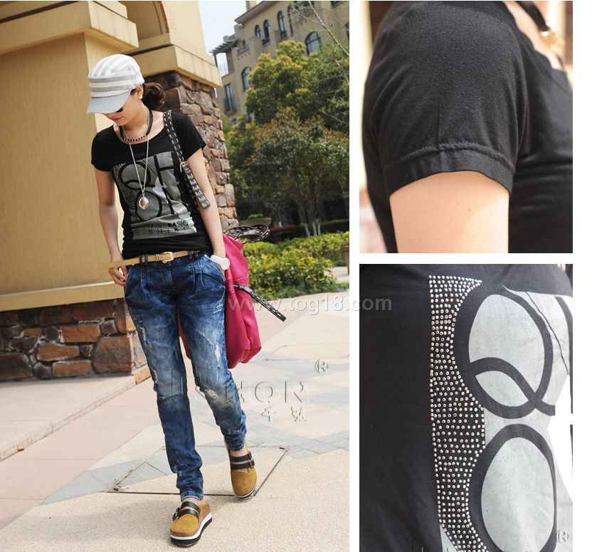 夏裝 新版修身顯瘦時尚百搭燙鑽印花圓領短袖女T恤