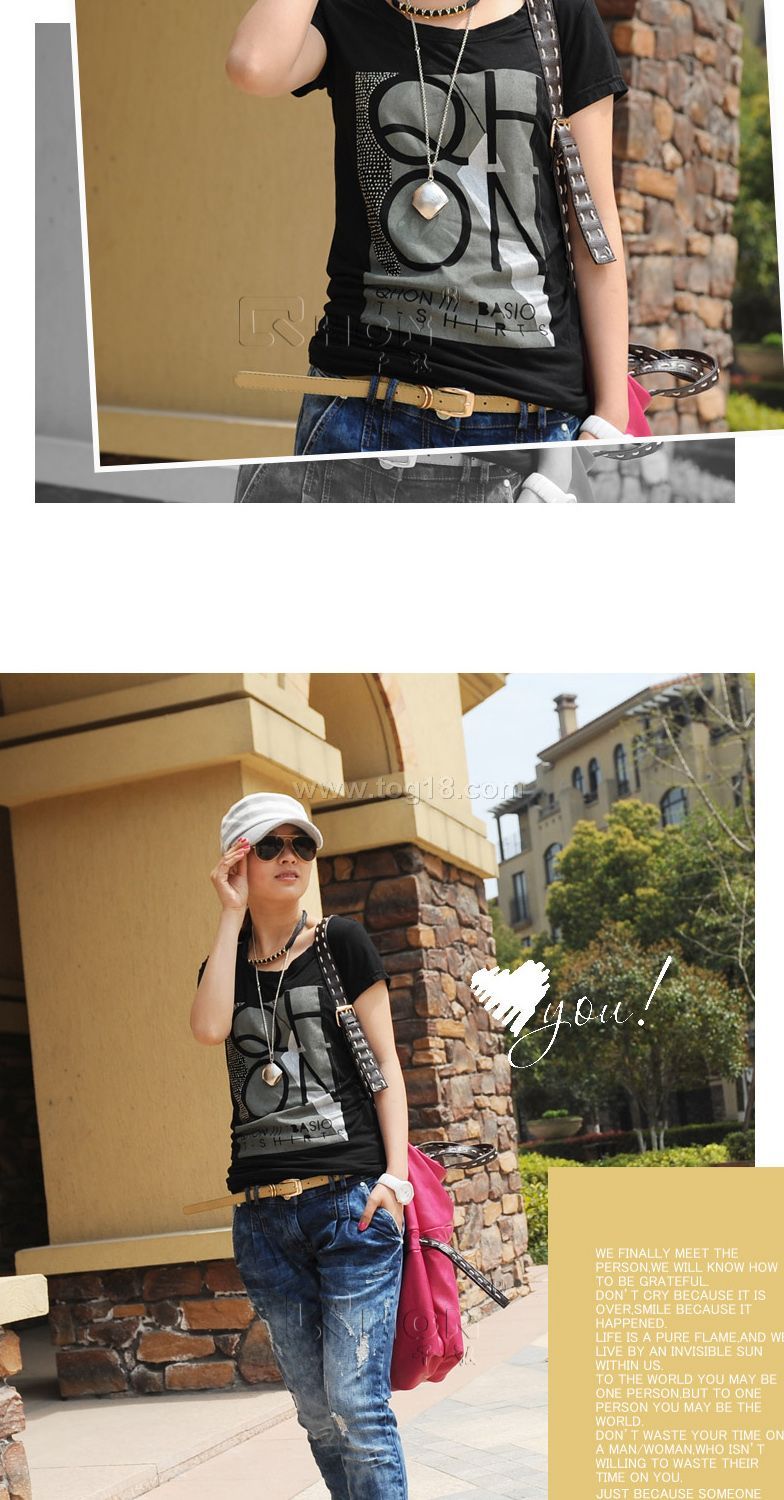 簡約的修身基本款T恤,絕對不會過時的超高配搭系單品!胸前的印花是千弘家的LOGO變形而成,絕對的獨一無二!採用了高技術膠漿印花,無僵硬感,不會脫落變形。印花一側有大片的亮晶晶的燙鑽,與印花LOGO相呼應,宛如渾然天成,精緻又亮眼!整款版型修身設計,收腰處理,非常顯瘦,能夠突出女性曲線。整體上身效果超棒,黑色百搭顯氣質,獨特的印花時尚、個性,潮感十足!大愛推薦!