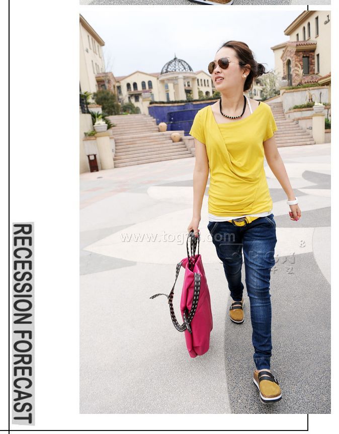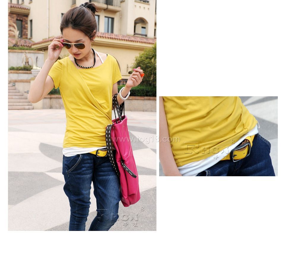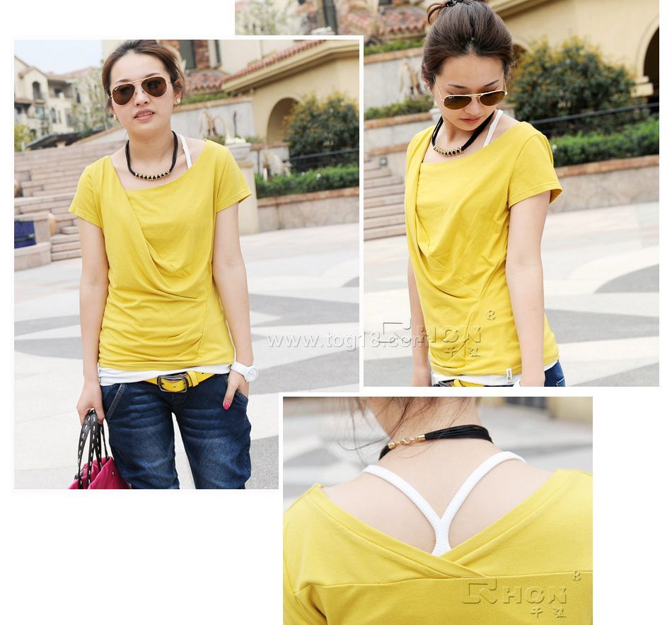 不規則的剪裁與設計,打破T恤的傳統與單調,帶來不一樣的穿著體驗,新鮮、時尚!獨特的斜門襟,加上面料本身的垂墜感,略為鬆垮的造型,慵懶中透著優雅的閒適,時尚又前衛!後領的V型設計,微微展露肩背部的小性感,更顯女性迷人特質。非常顯氣質的一款T恤,修身的板型,上身效果很不錯,時尚、清新、搶眼!超百搭的強品。