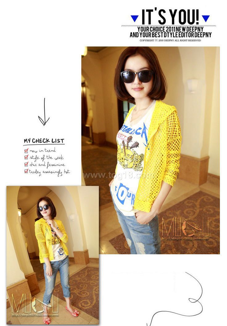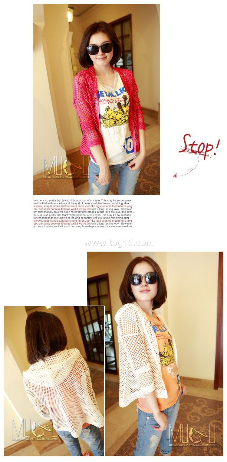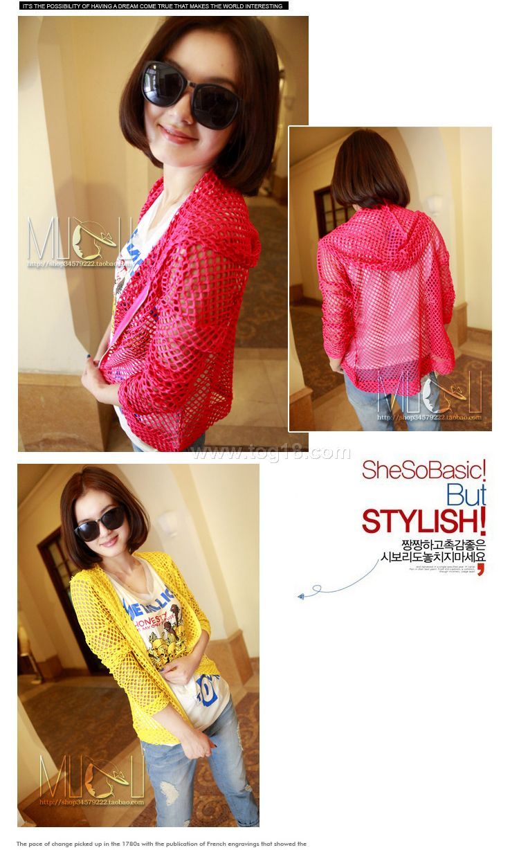 青春甜美輕薄透視鏤空拉鏈撞色連帽開衫外套