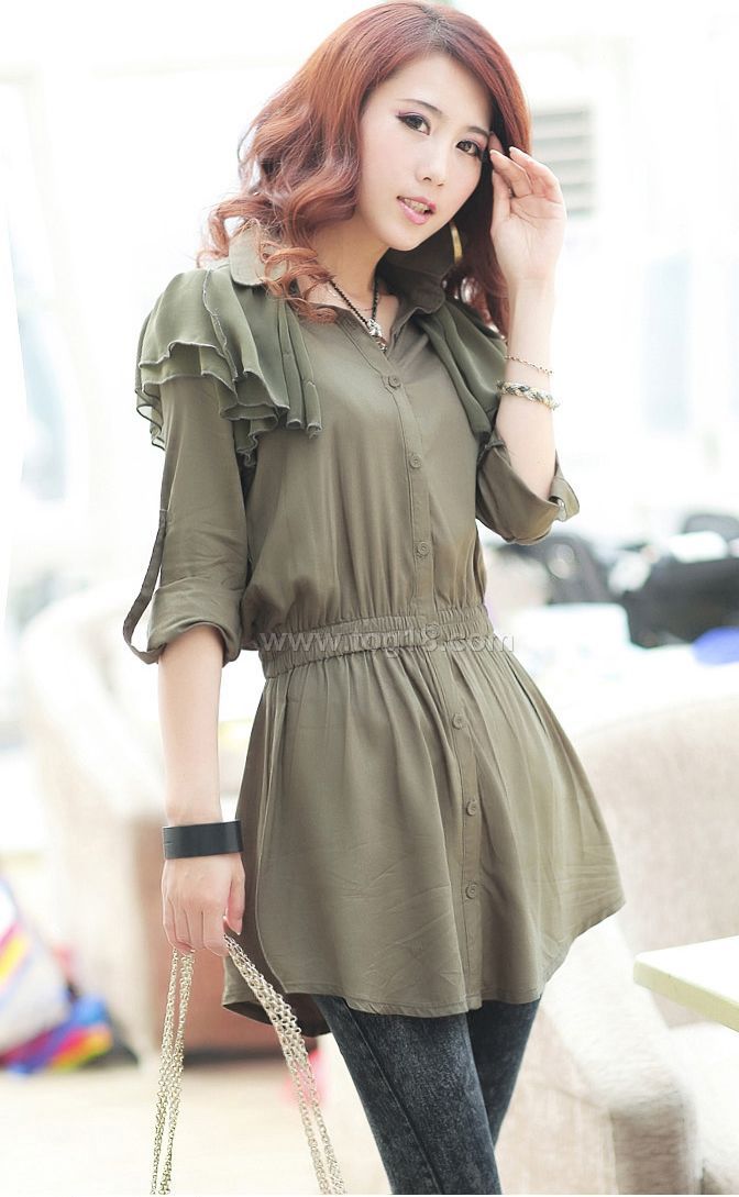 多層的荷葉袖設計創造出立體感,腰部的鬆緊,