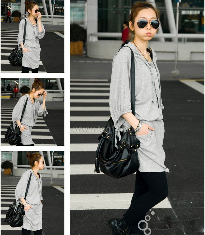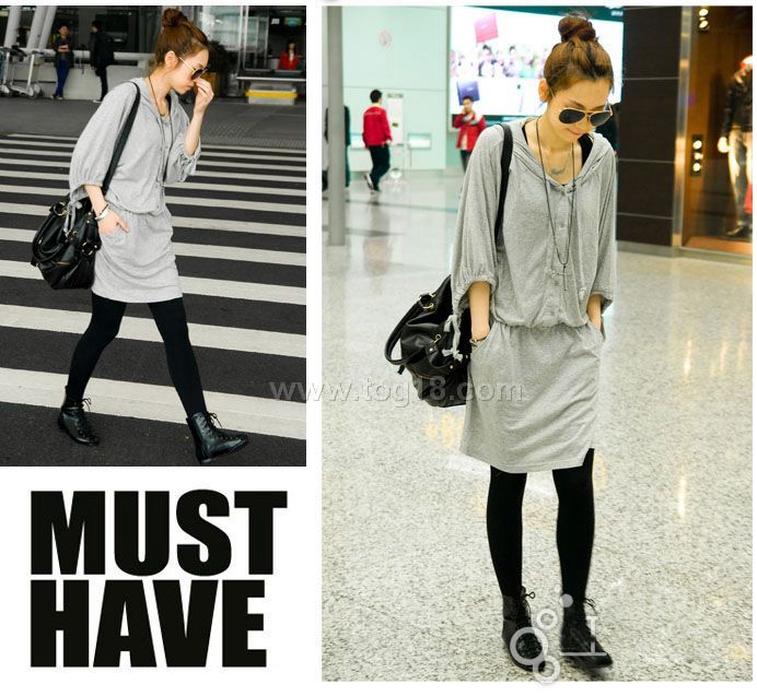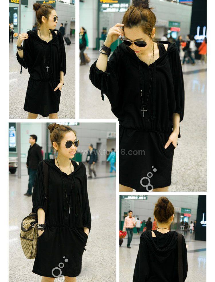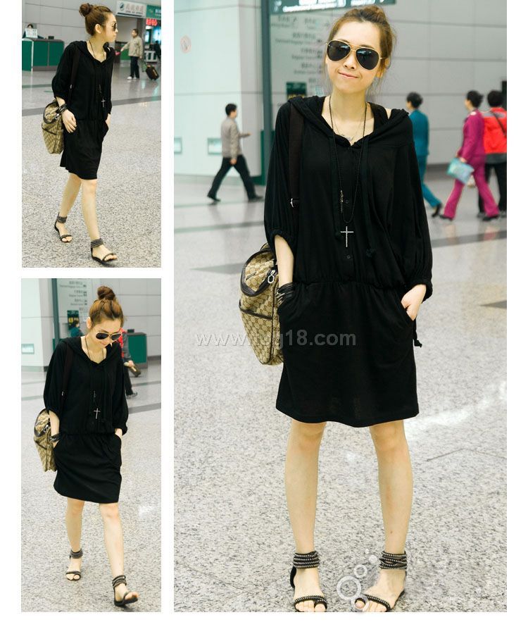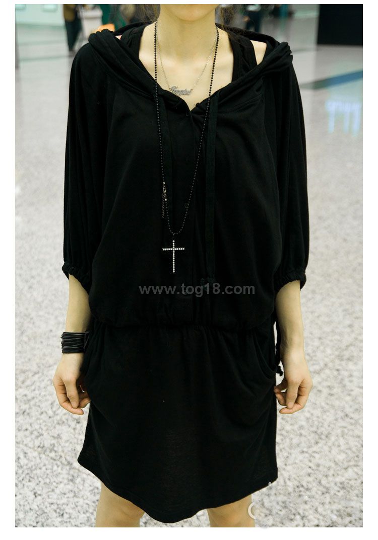 • 夏秋裝最新款韓版女裝純色七分袖帶帽連衣裙