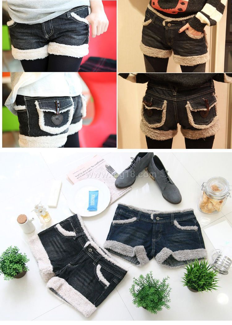 款式說明: 一款屬於秋冬季時尚的牛仔短褲.仿羊羔毛拼接栽剪.獨特的牛角扣裝飾,低腰設計,兩色三碼選擇,
