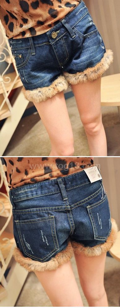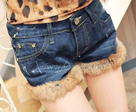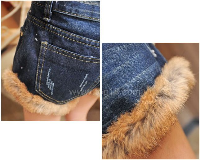 2011秋冬新款百搭兔毛毛卷邊翻邊拼接牛仔短褲熱褲