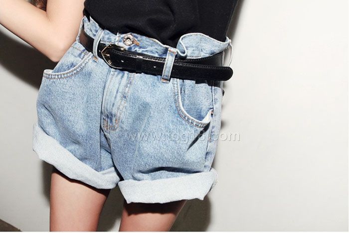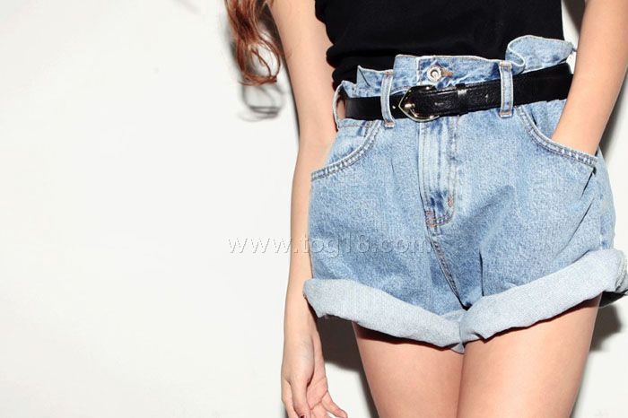 牛仔短褲 復古高腰顯瘦寬鬆水洗淺藍色
