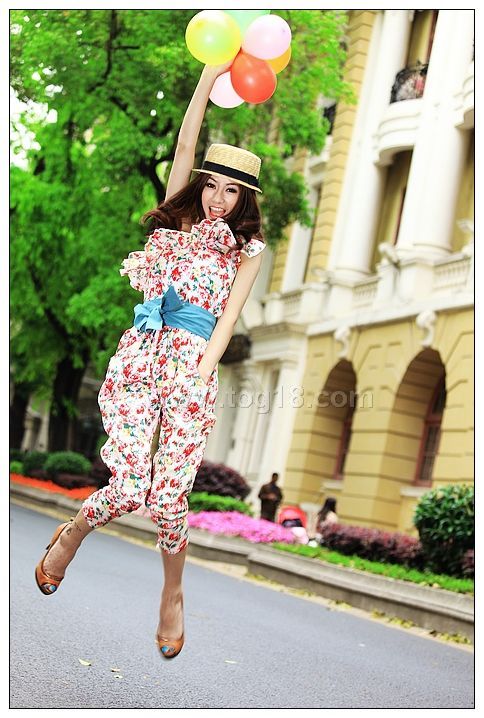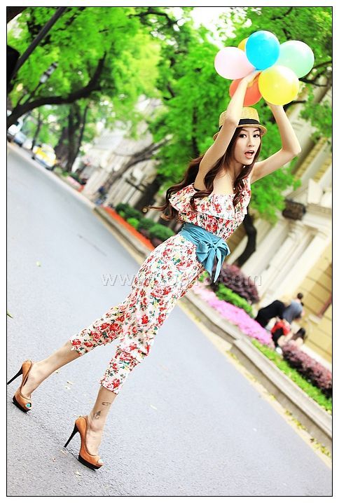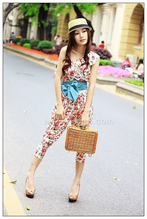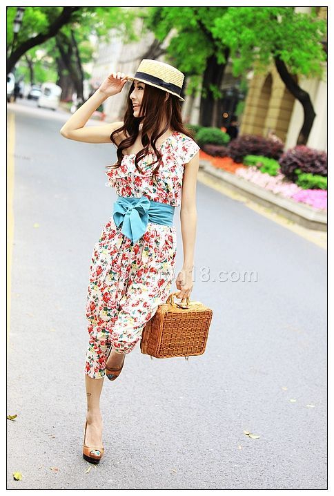 2012新款 荷葉邊斜肩九分碎花連衣褲