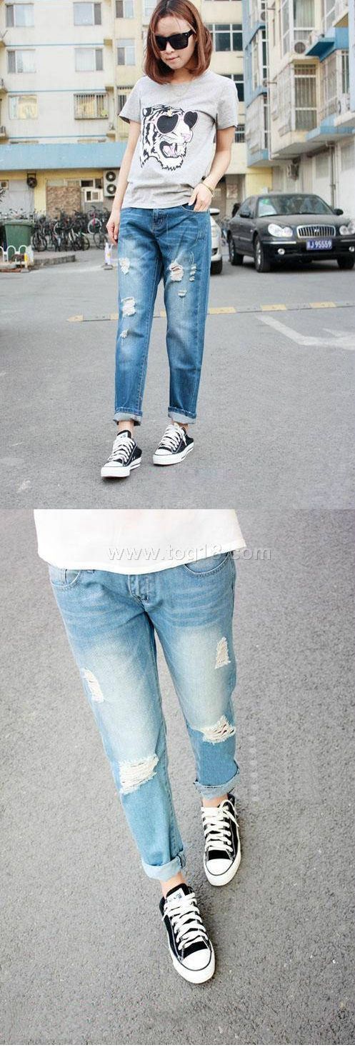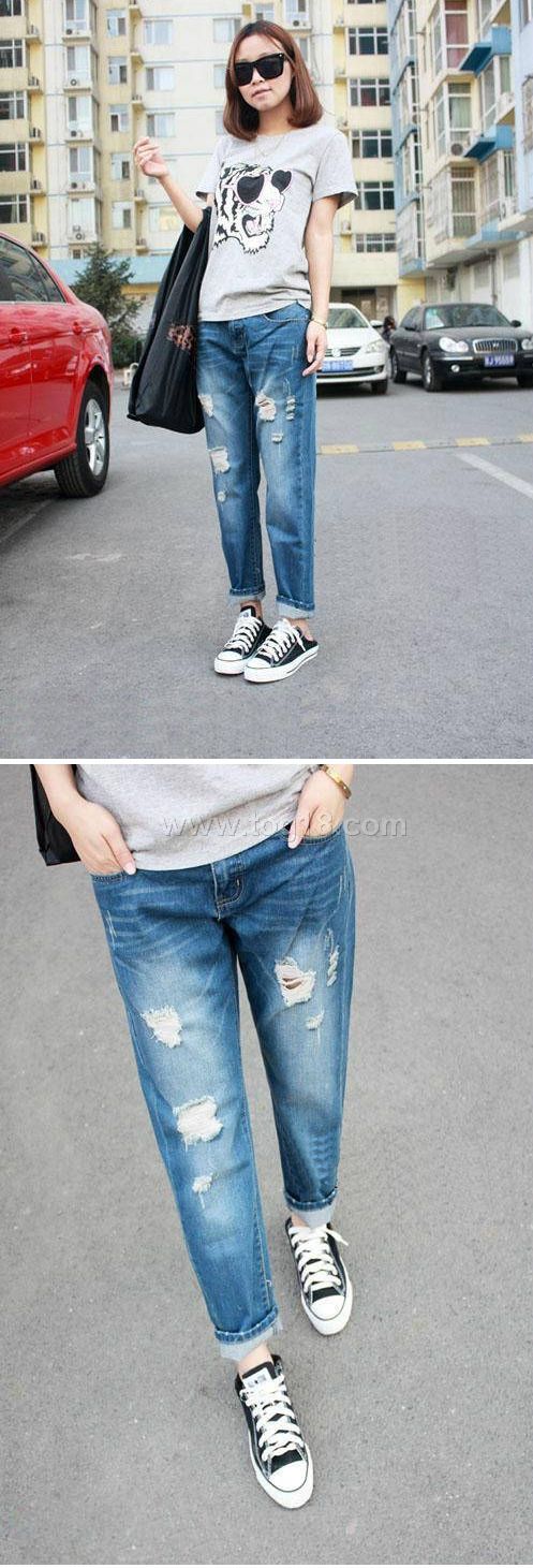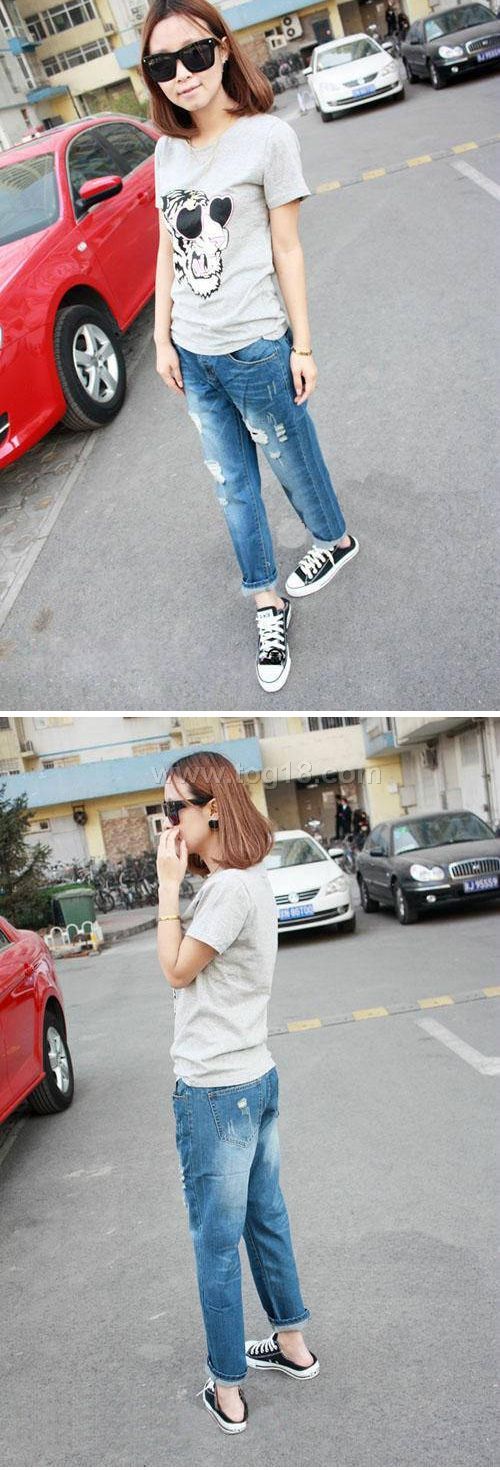 2012歐美boyfriend寬鬆大碼破洞休閒牛仔哈倫垮褲女