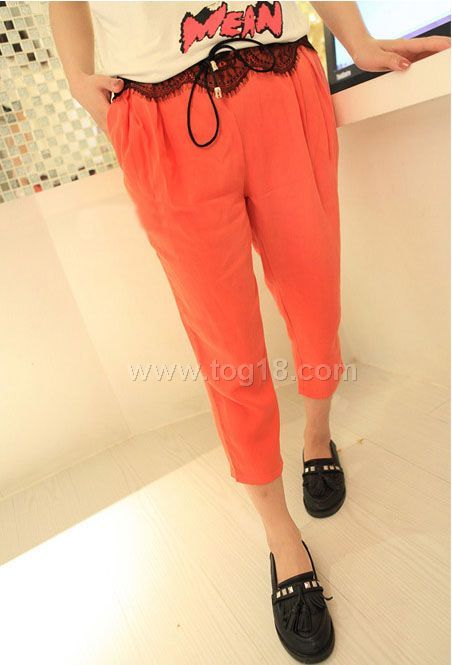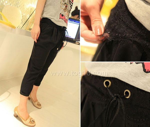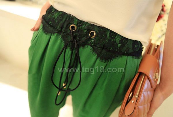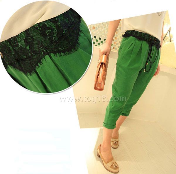 2012新款 腰间黑色蕾丝 抽绳真丝七分裤
