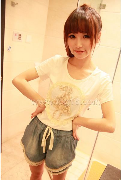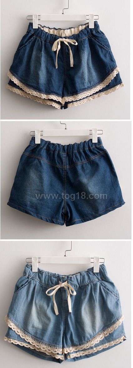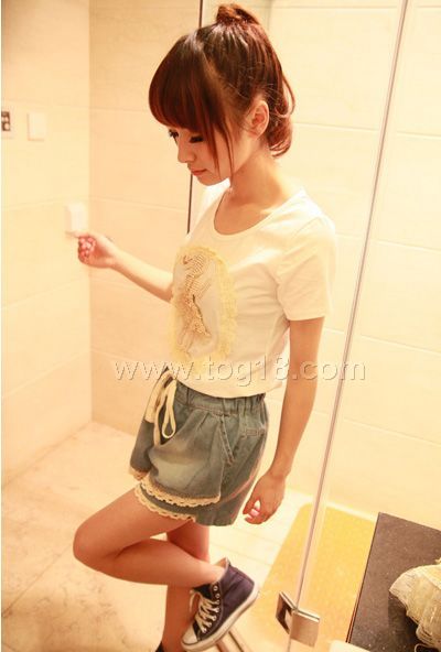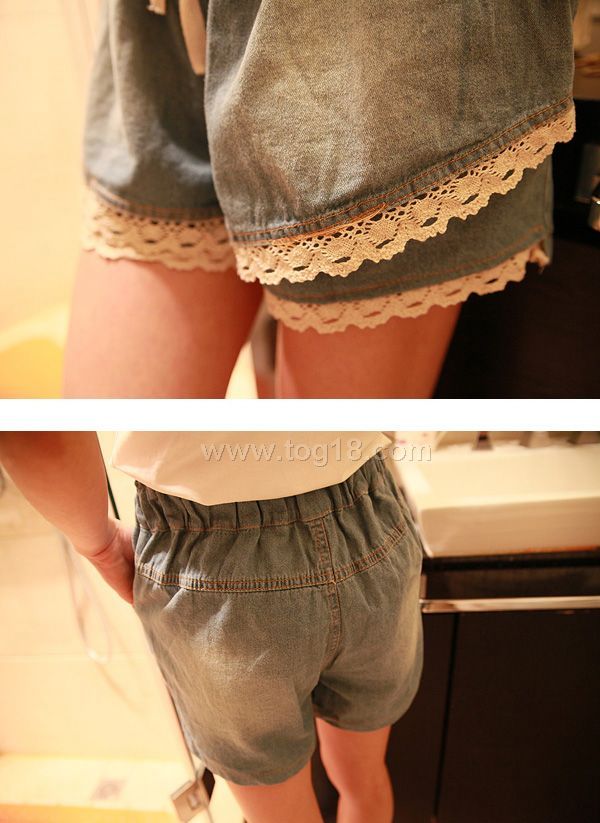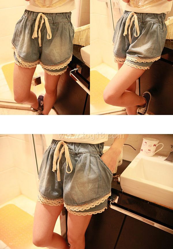 2012新推荐 双层 抽绳收腰镂空花边牛仔短裤