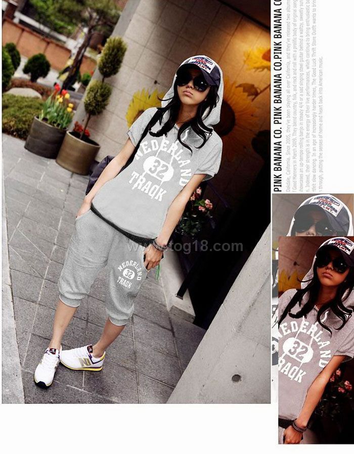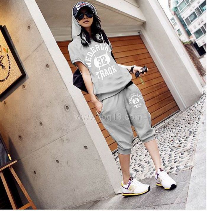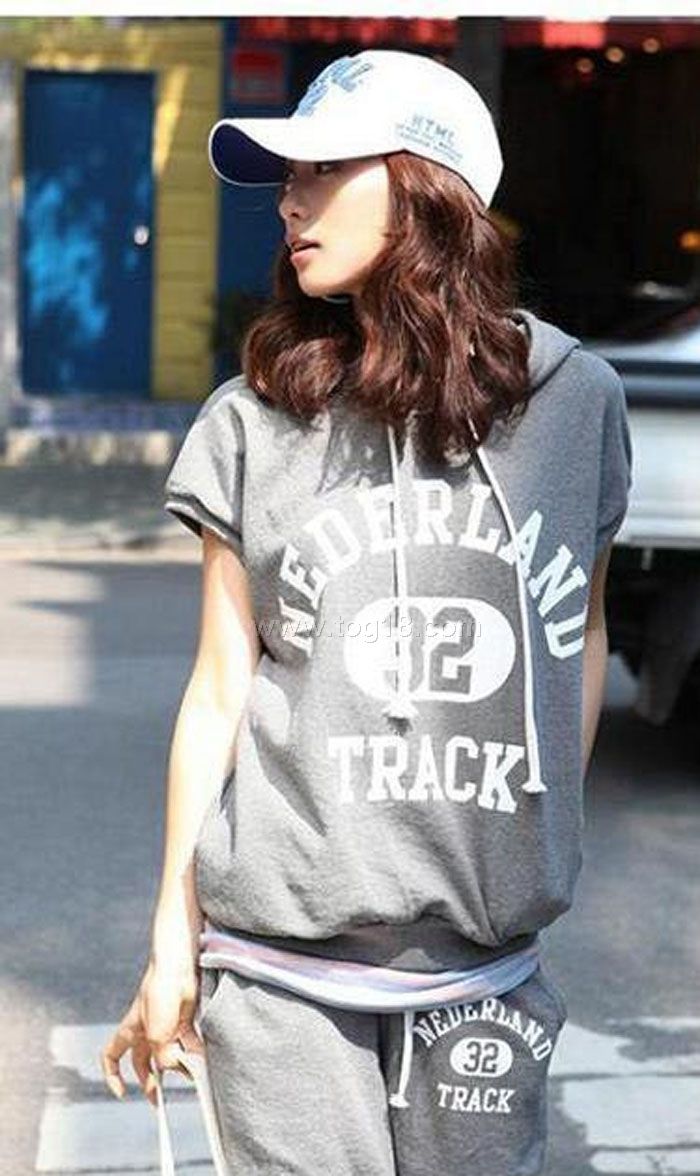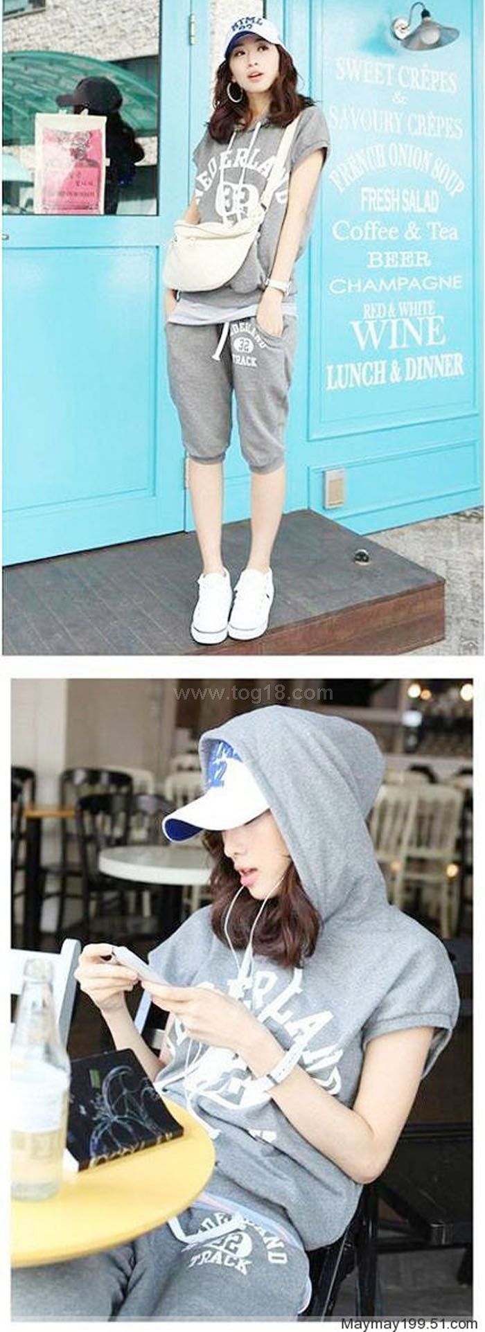 韩版夏季连帽短袖32号+休闲七分裤运动套装淑女百搭瑜伽运动