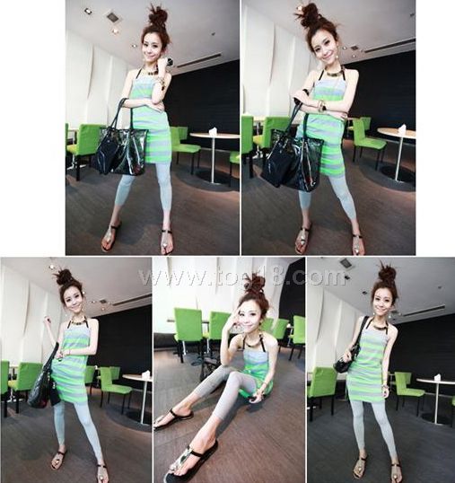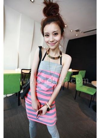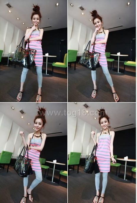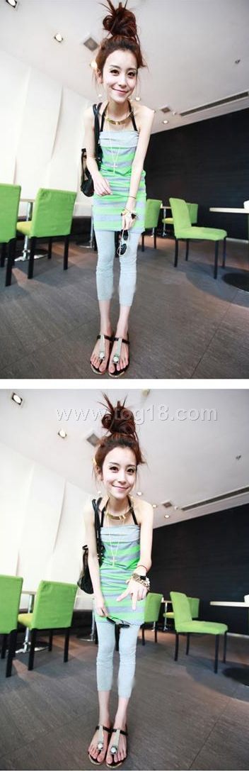 款式說明: 洋氣版別緻螢光色條文抹胸休閒套裝