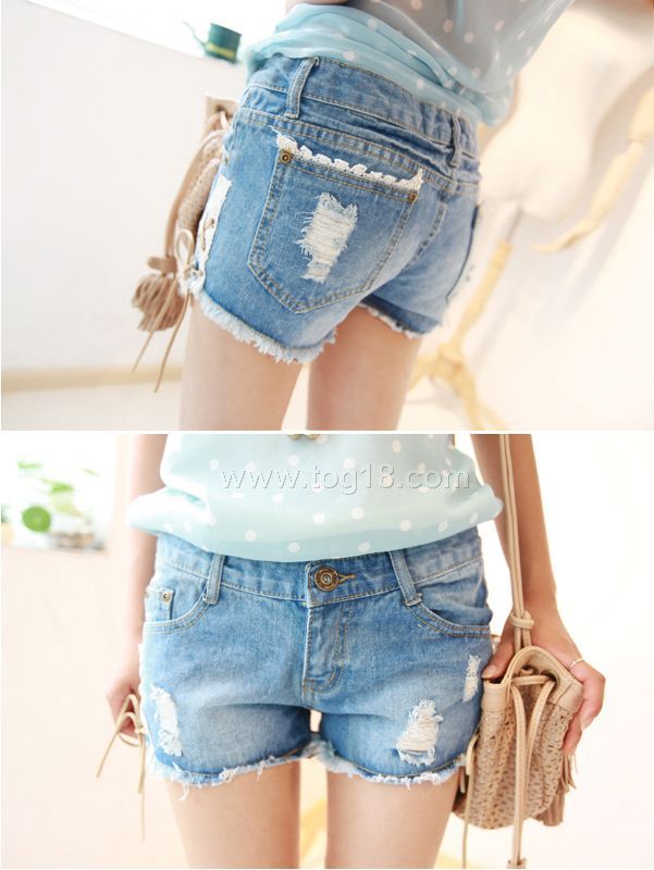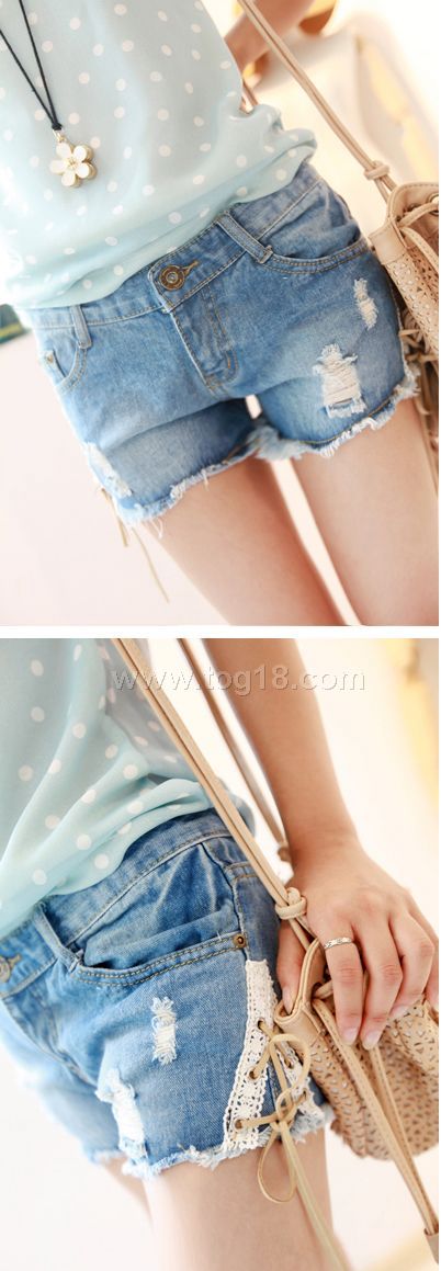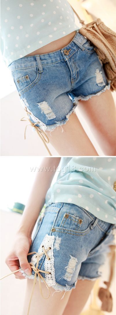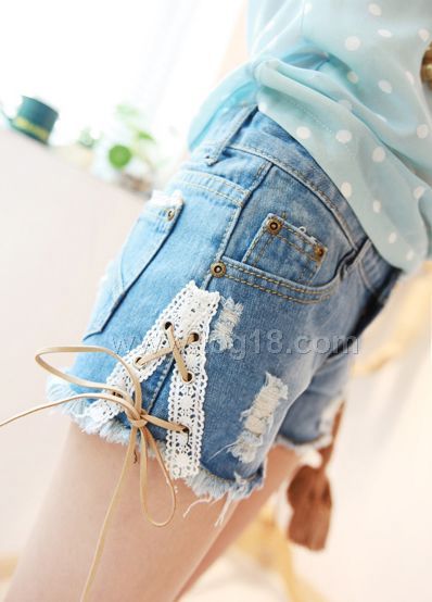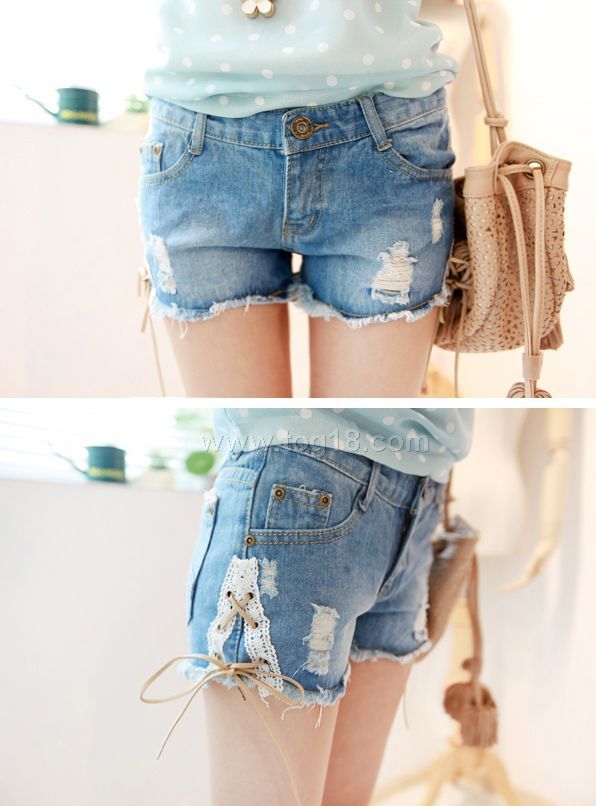 2012小清新 麂皮系带 蕾丝 倒V 个性 破洞牛仔短裤