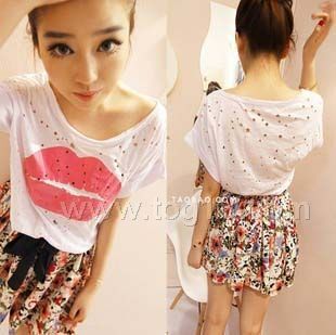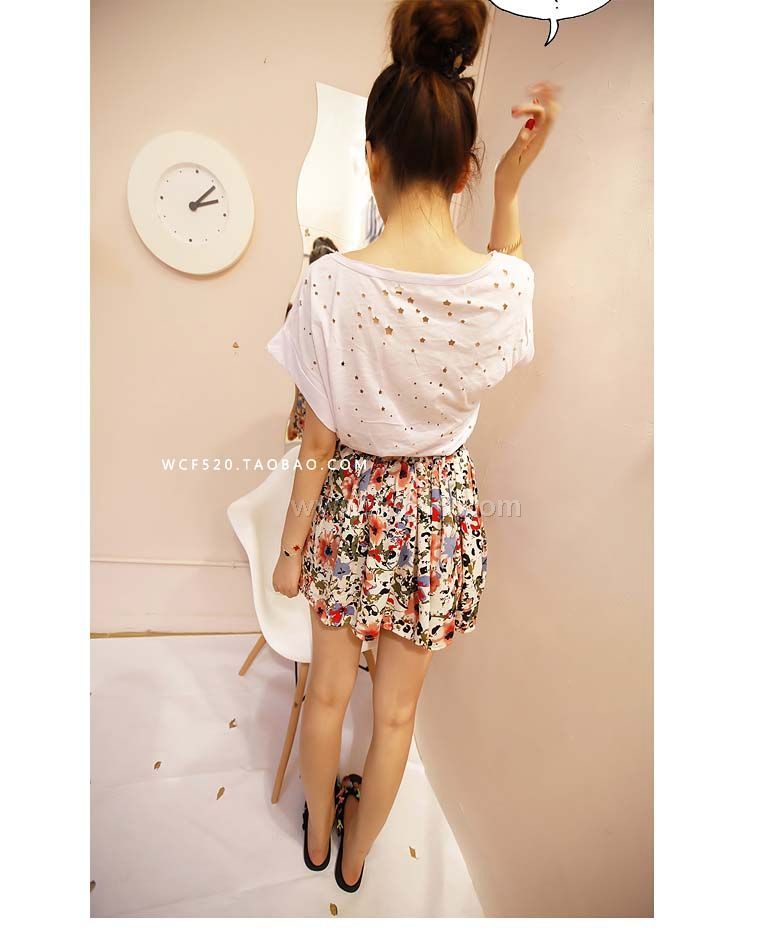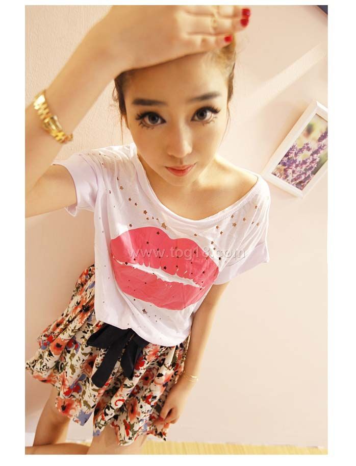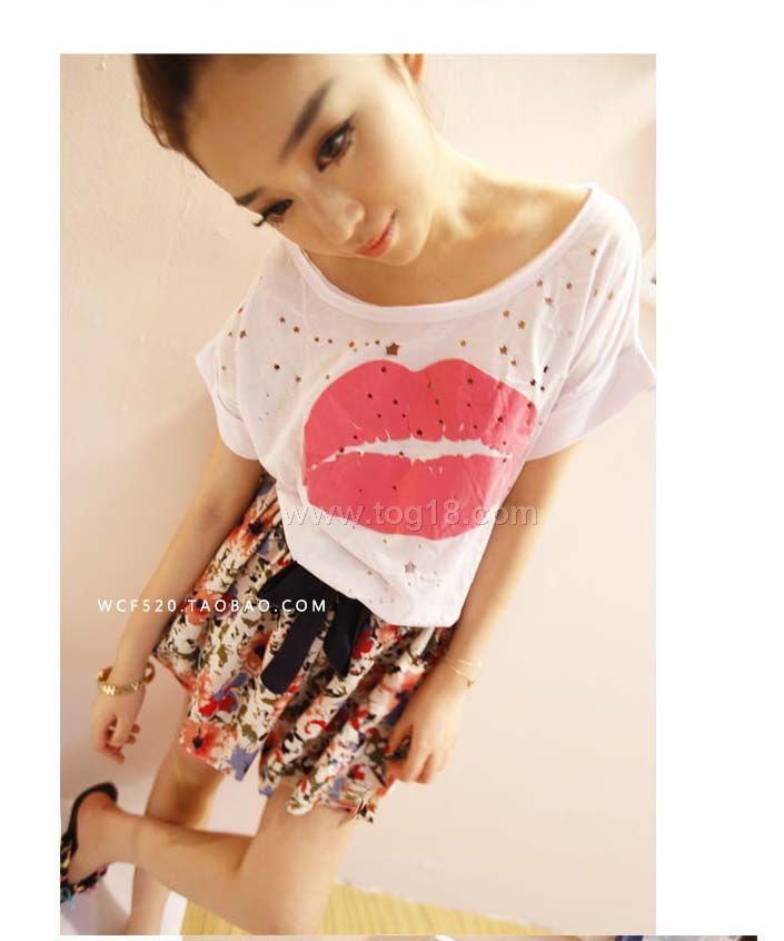 2012星星鏤空嘴唇潮T搭配花朵短裙組合兩件套