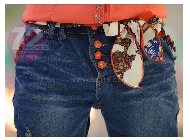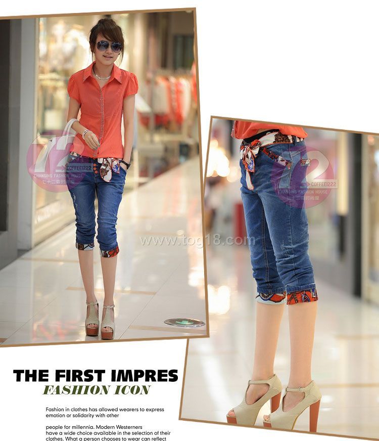韓版女裝夏季新品現瘦細節配絲帶卷邊牛仔七分褲