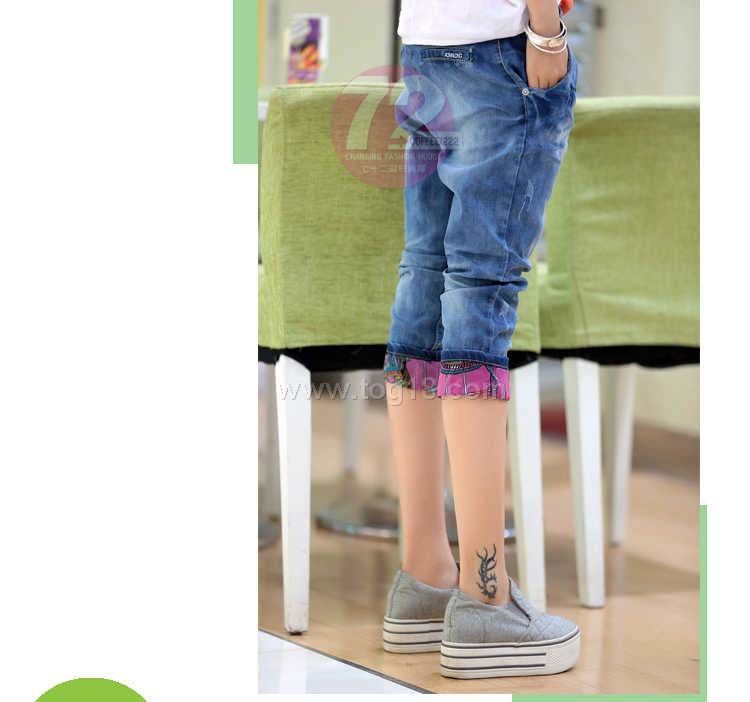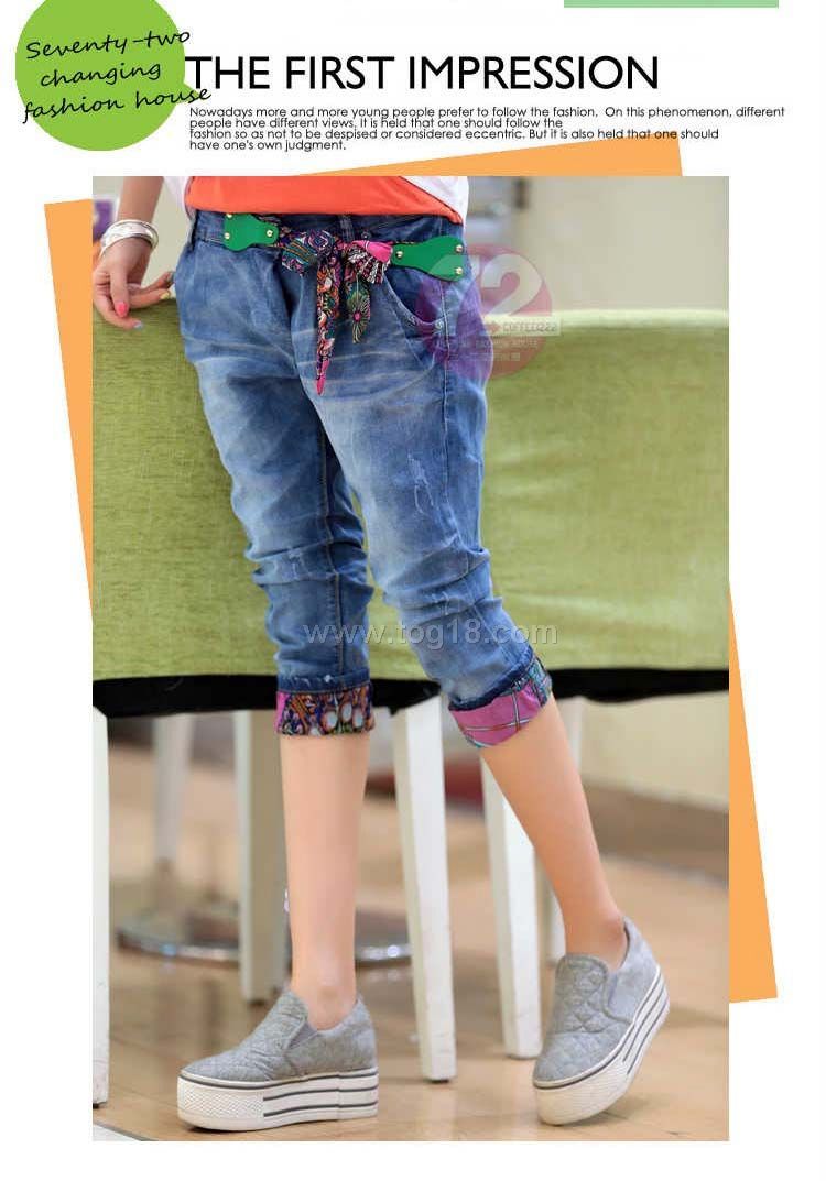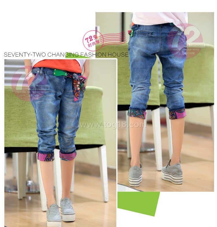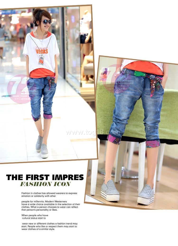 韓版2012夏裝新款卷邊寬鬆小腳牛仔拼接七分褲女