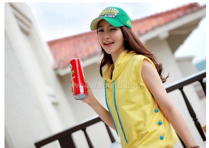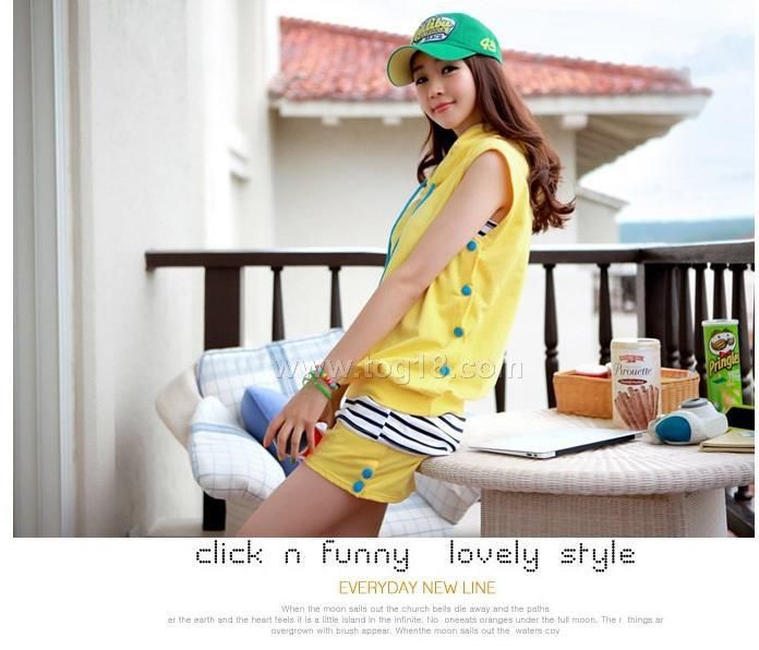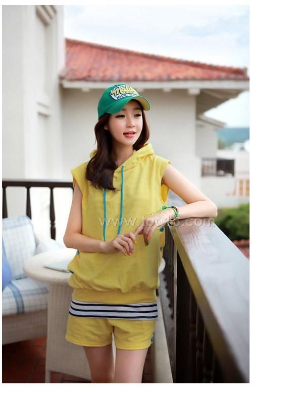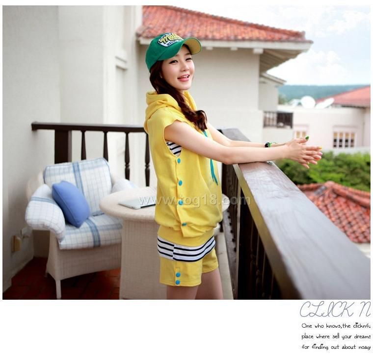 韓版服飾 清新活力連帽無袖T恤+短褲+背心三件套休閒套裝