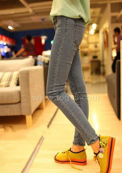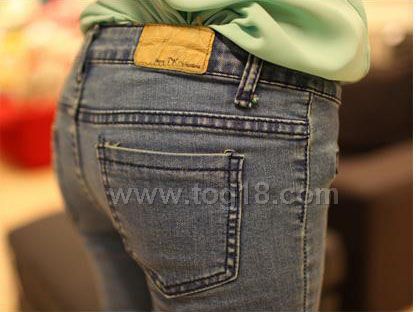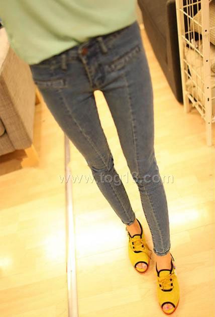 超包腿修身復古藍 假口袋 中縫顯瘦鉛筆小腳褲 牛仔長褲