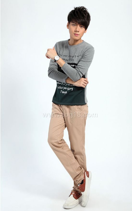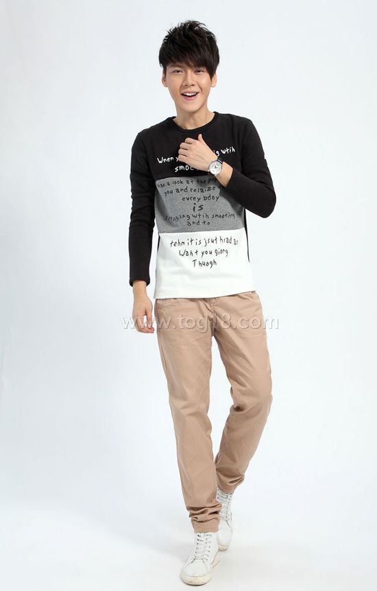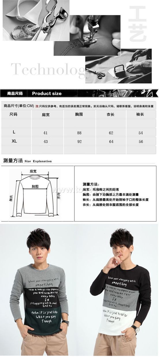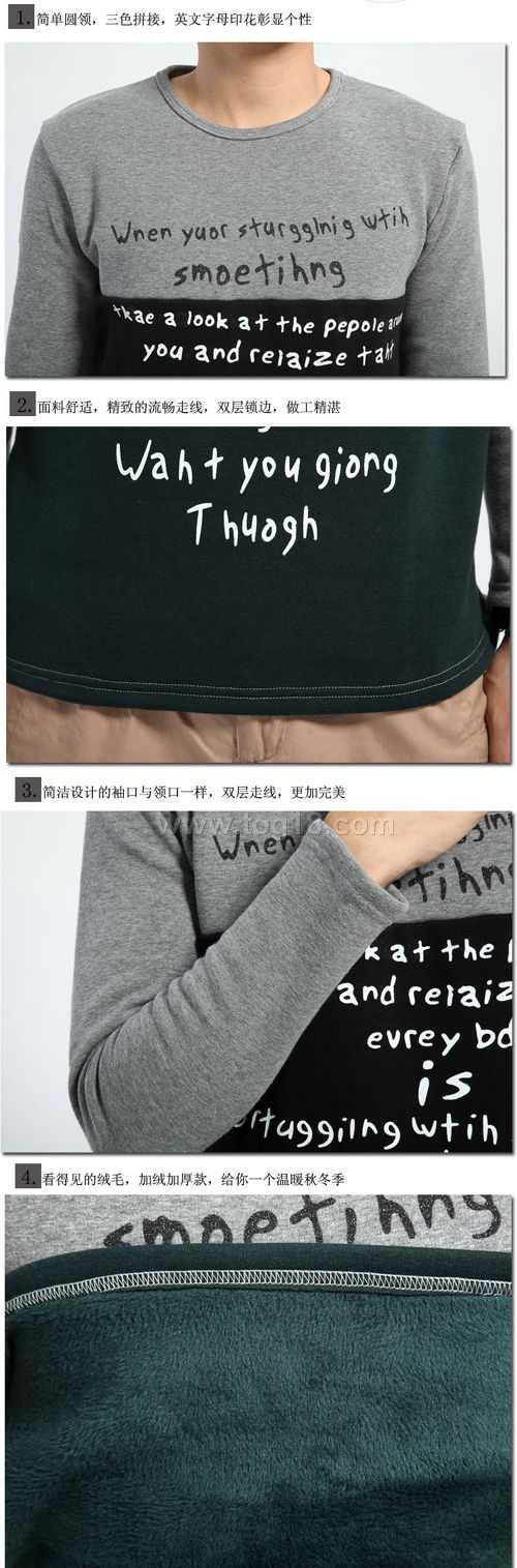 新款保暖加絨加厚男士長袖T恤英文字母拼色拼接打底衫