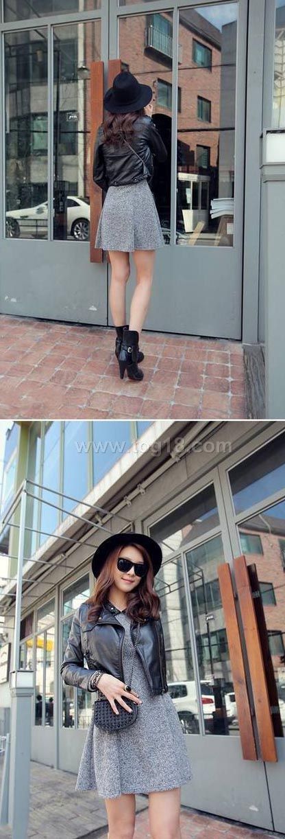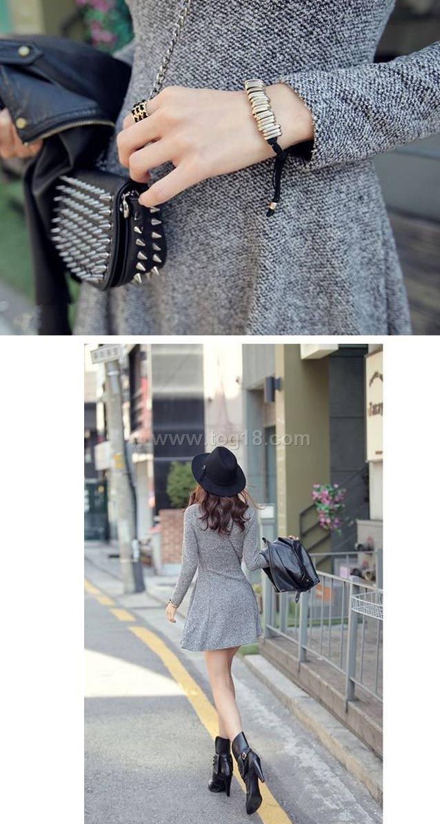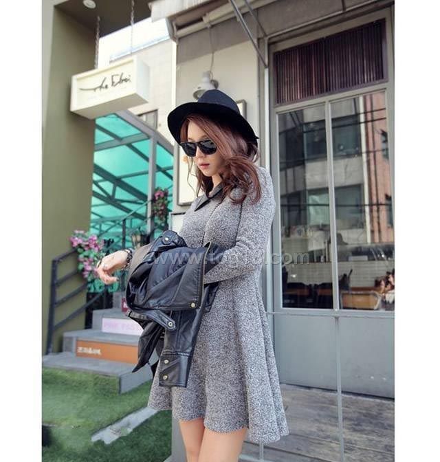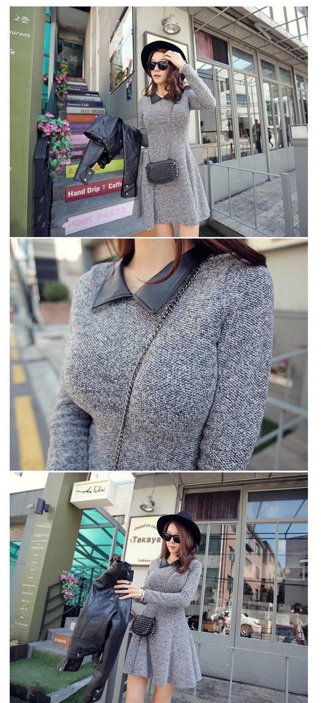 秋冬新款撞色皮領子收腰連衣裙打底裙