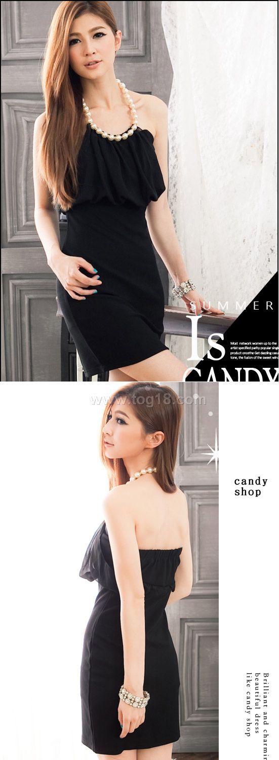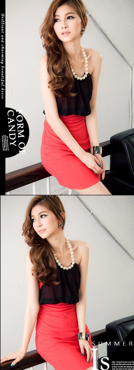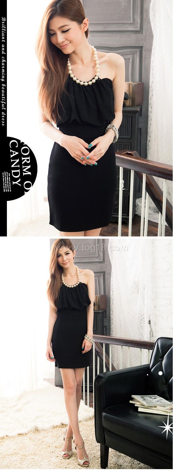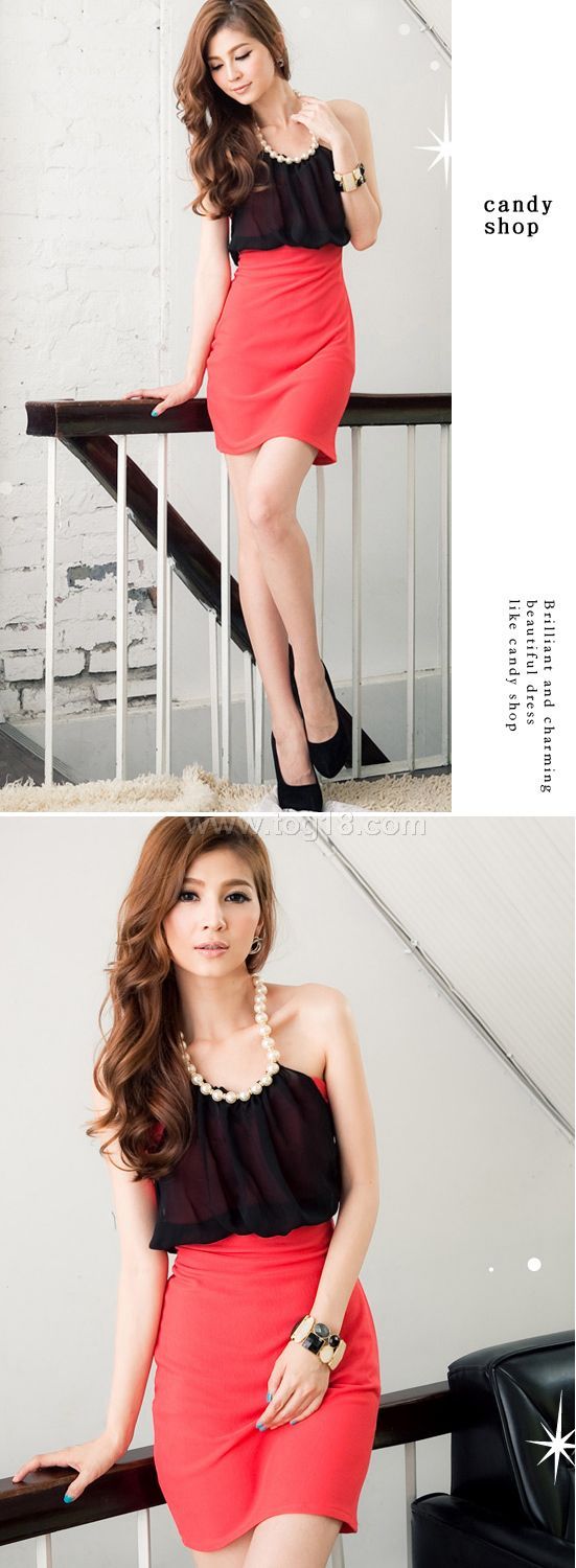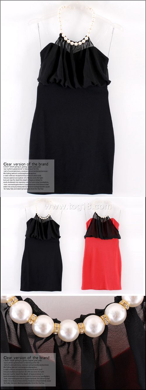 款式說明:氣質名媛珍珠項鏈削肩拼接雪紡包臀禮服連衣裙
