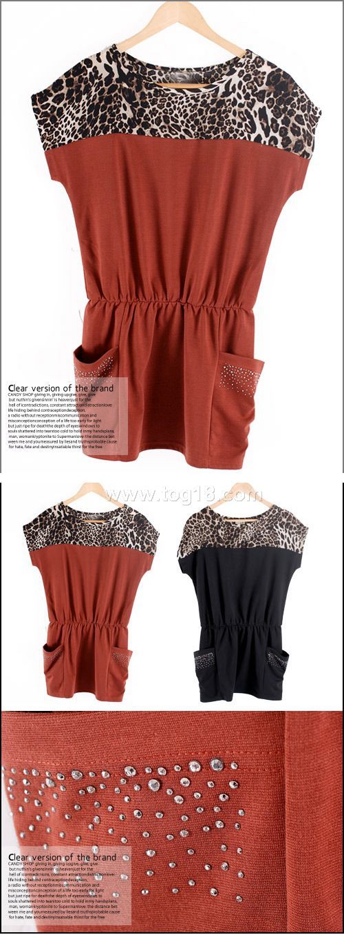 款式說明:優雅豹紋拼接口袋燙鑽收腰洋裝連衣裙